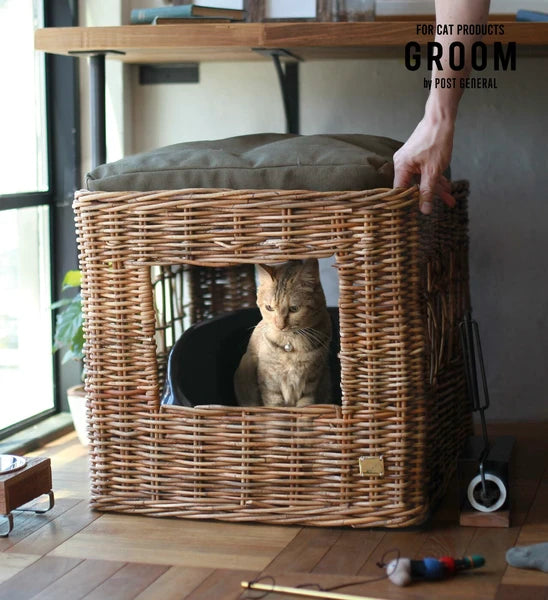 皮付きラタンを使って編まれた猫用トイレカバー。