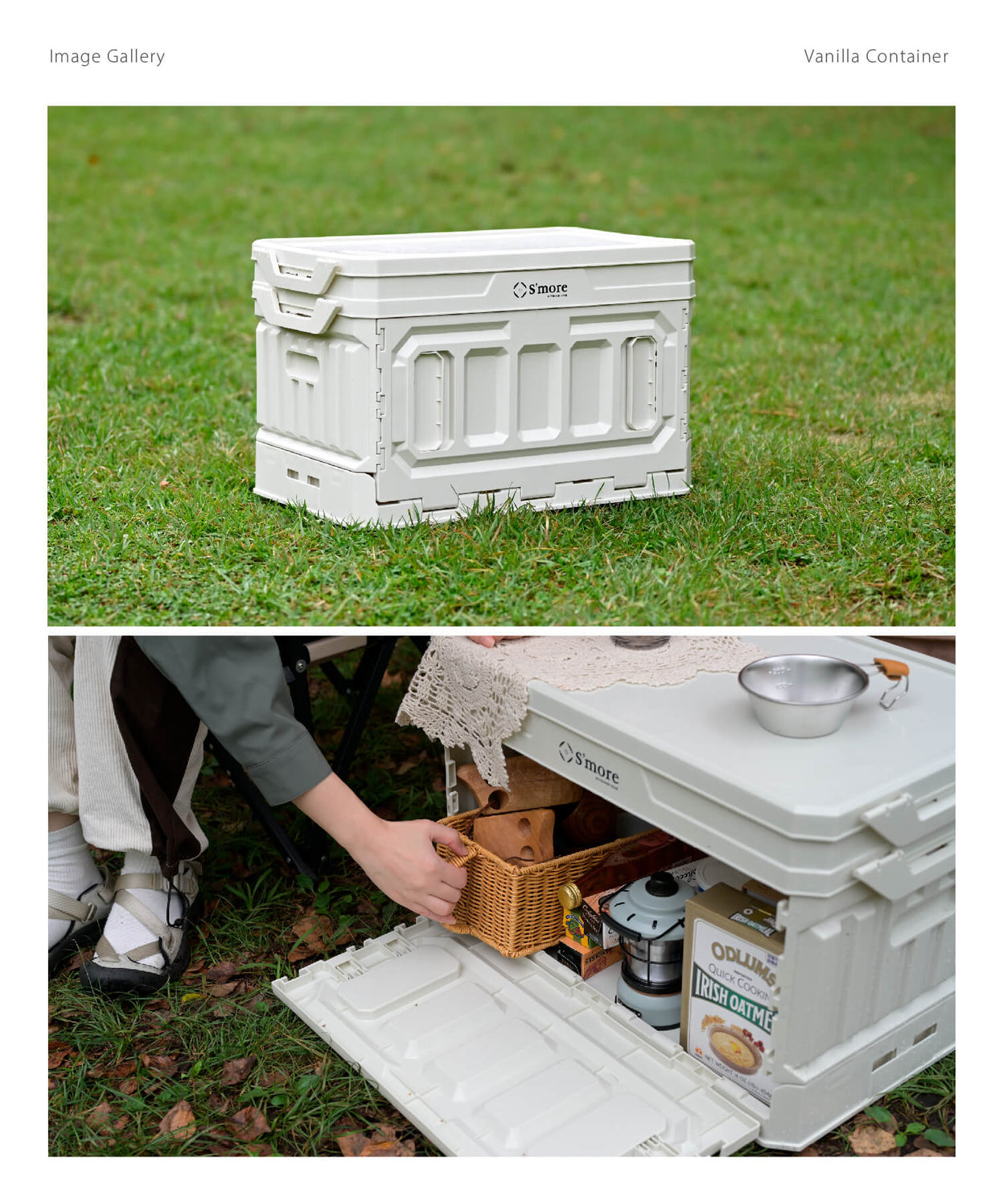 コンパクトに畳めるコンテナボックスです。前面後面の仕切りが開くので荷物を取り出しやすくなっており、キャンプ時の収納ボックスにとても便利なアイテムです。