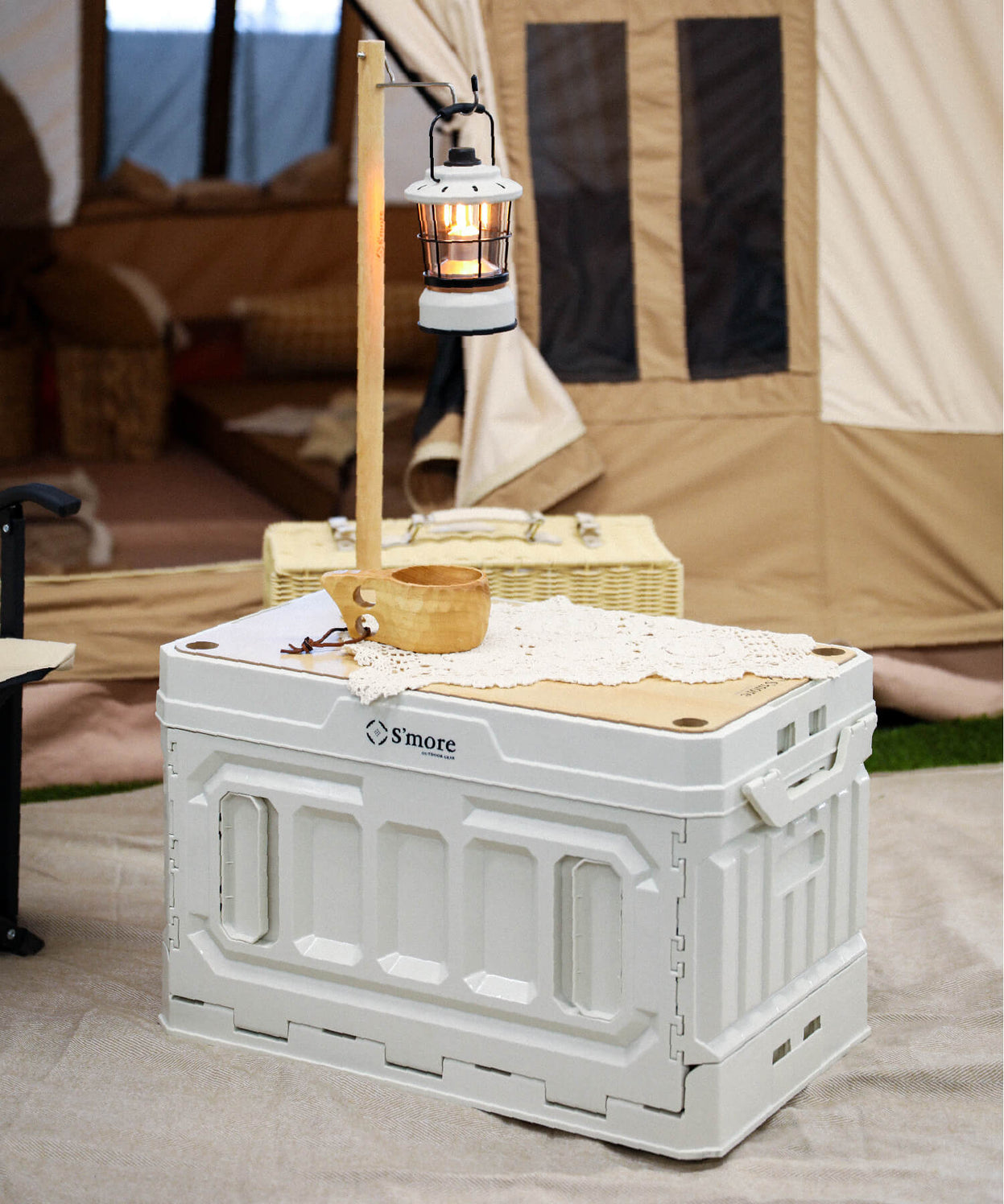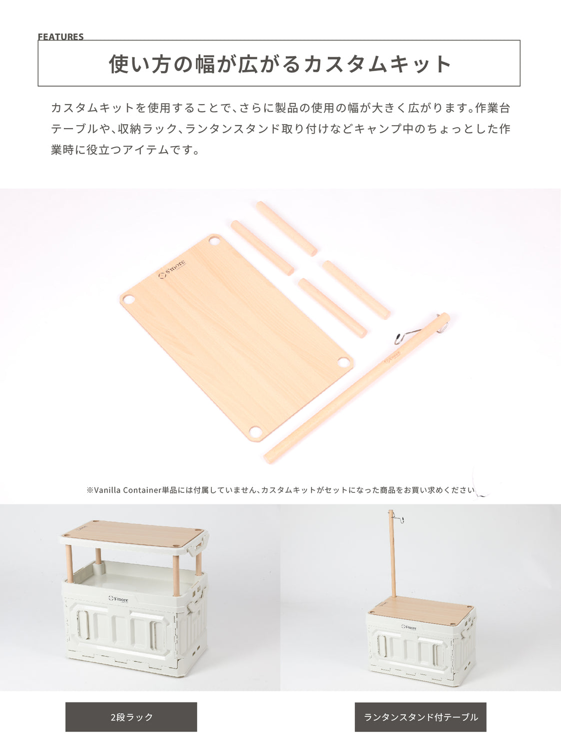カスタムキットでコンテナが作業台や簡易テーブル、ランタンスタンドに拡張できる便利キットです。