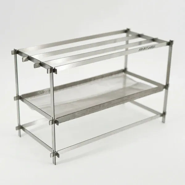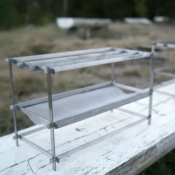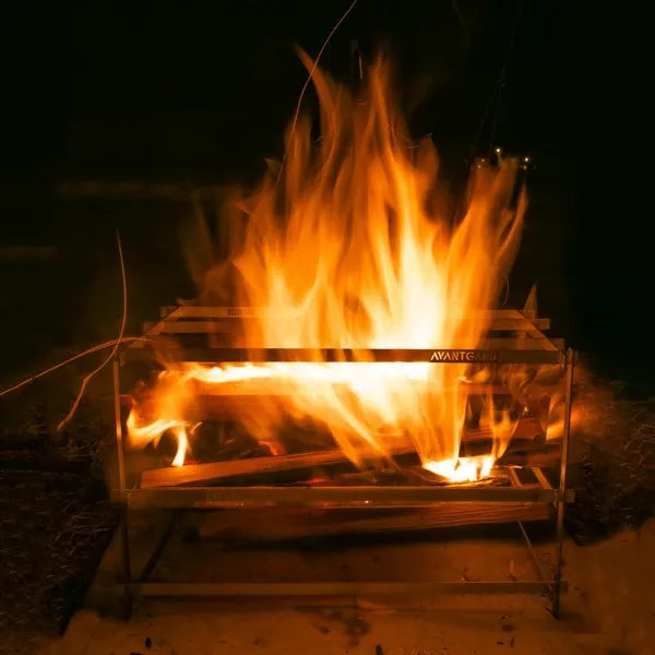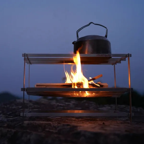 初心者から中堅キャンパー、ソロキャンプからファミリーキャンプまで。 「AVANT GARDE flat bar mesh bonfire stand」はスタイリッシュかつ実用的なデザインで焚き火の魅力を最大限に引き出す新感覚の焚き火台です。 1.収納時のサイズは約3.5cm×40cm、約1kgと軽量化されているため、バックパックや車のトランクにはもちろん、バイクや自転車にも気兼ねなく積めます。 2.パーツが少ない&形がシンプルだから、まるでブロックのようにパーツを組み合わせて、組み立てができます。 3.変幻自在だから、アウトドアのインテリアとしても使えるシンプルなパーツ。 4.スリムでコンパクトなのにタフなボディ! 5.火床には特殊耐熱ステンレスメッシュ、バーの素材にはステンレス鋼の中でも加工時に伸ばしやすく、粘りの強さが魅力のステンレス鋼「SUS304」を採用しました。