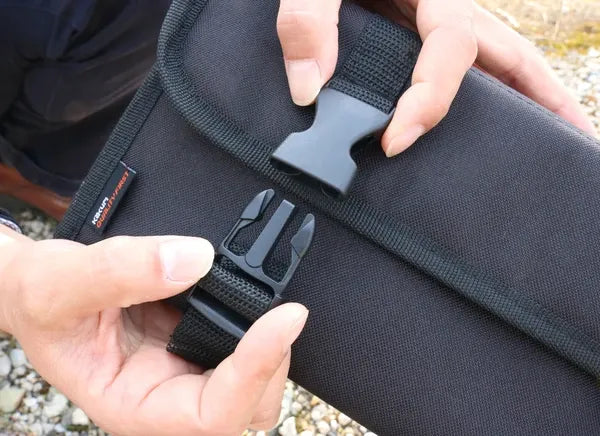 2つのバックルを留めれば、ガッチリと閉まりすきまがなく、持ち運びの際に中身が飛び出るのを防ぐ。