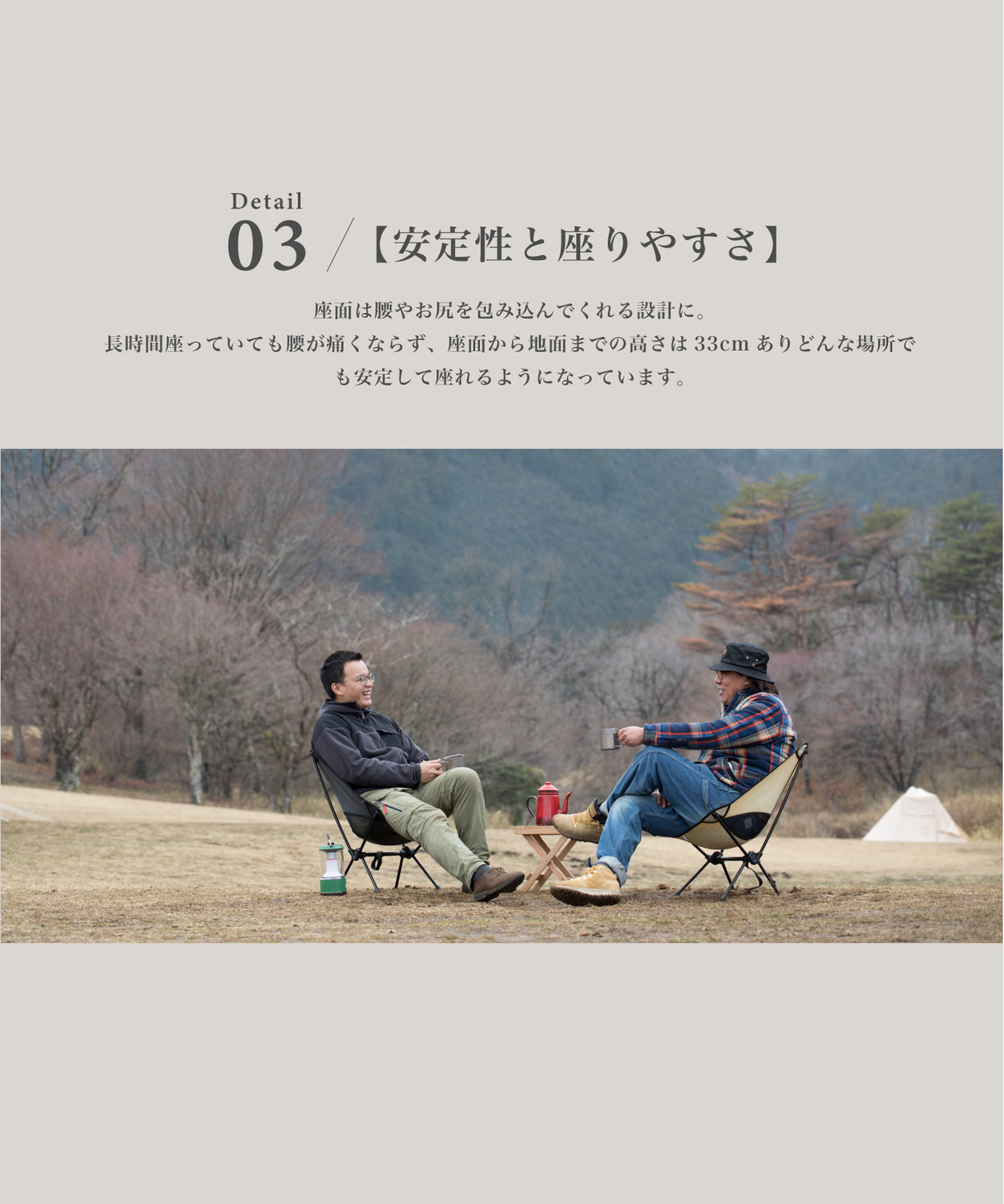 座面は腰やお尻を包み込んでくれる設計に。長時間座っていても腰が痛くなりにくく、座面から地面までの高さは約33cmありどんな場所でも安定して座れるようになっています。