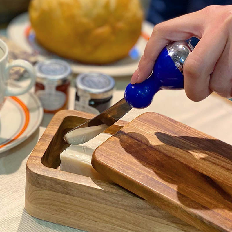 自立タイプのカラフルなバターナイフ。コロンとした形状が愛らしく、一度使うと手放せなくなってしまう可愛いアイテムです。バター用、ジャム用と色違いで揃えておけば、食卓を楽しく賑やかに彩ります。お子様でも使いやすく、ささやかなギフトとしても喜ばれます。