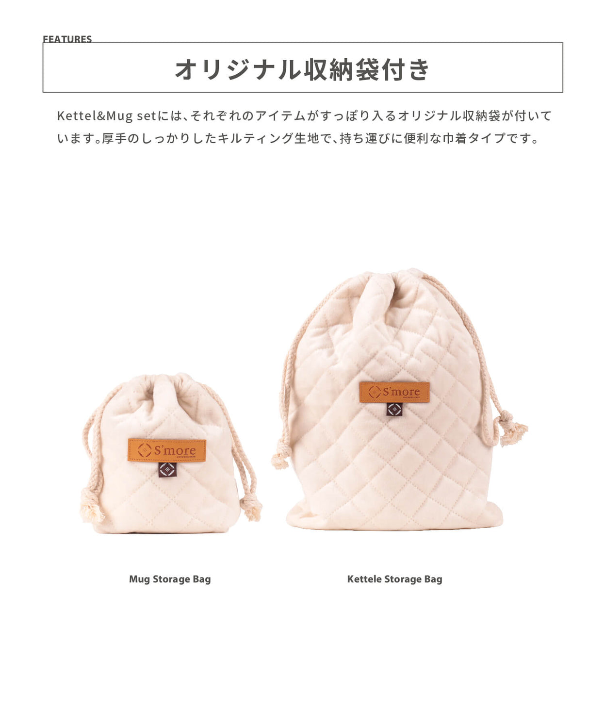 ケトル1個、マグ2個、収納袋3個がセットになったアイテム!