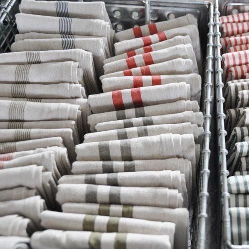 使い捨てのキッチンクロスにはその良さもあるけれど、毎日目にする景色としては色気がありません。毎日丁寧に洗って清潔に保つ、傷んだら次の用途で使う。その暮らしこそが美しい。洋皿もすっぽりと覆える大きなクロスなので、ラックの目隠しやランチョンマットとしても重宝します。