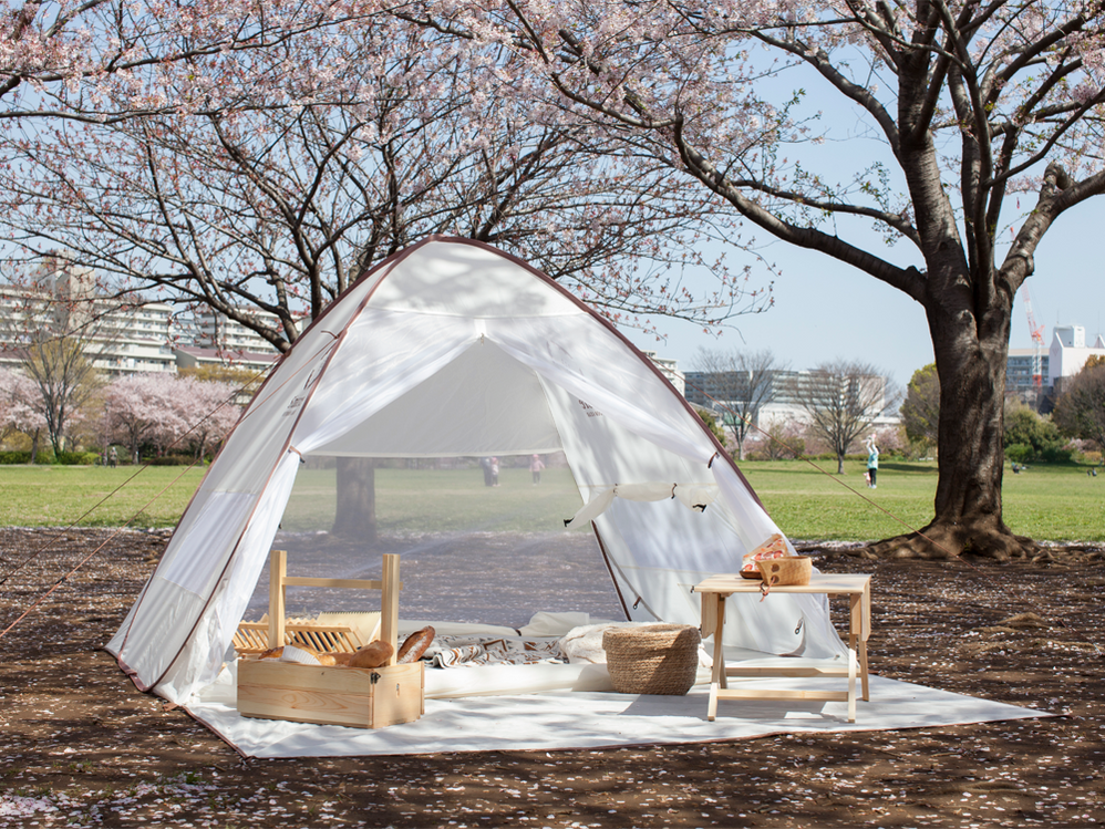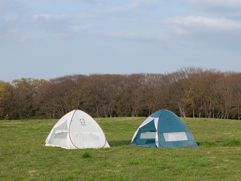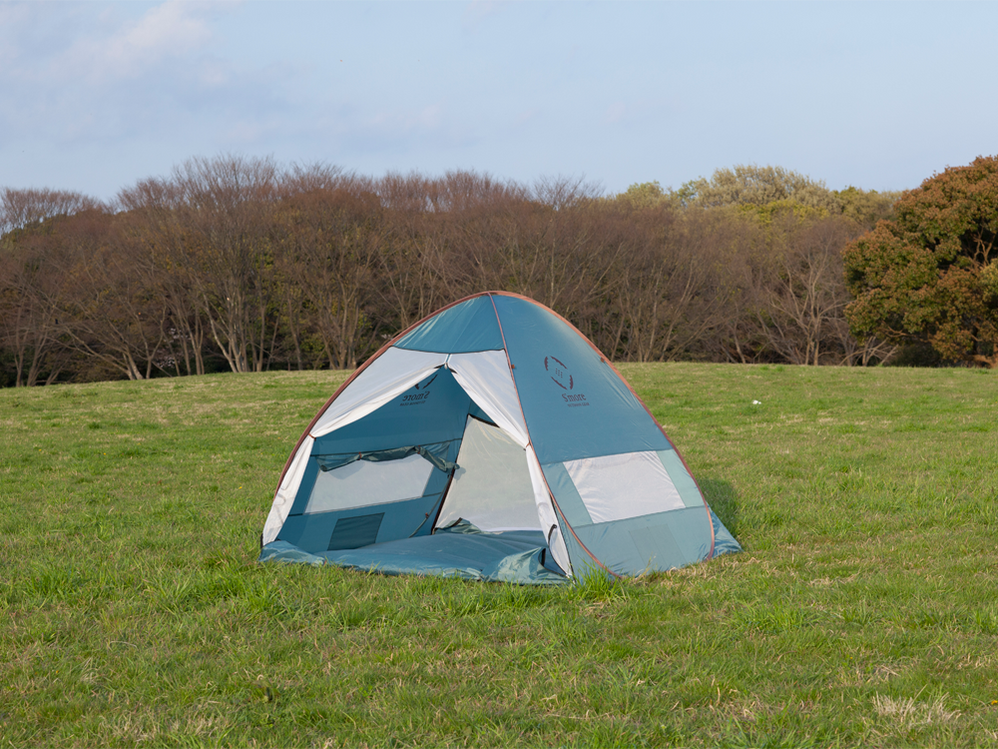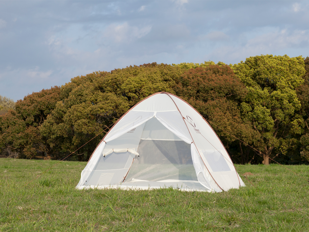すでにテントにはフレームが入った状態なので、収納袋から広げるだけでテントの設営が可能です。(設営の際は周囲に人や物がないことを十分に確認した上で設営を行ってください。)