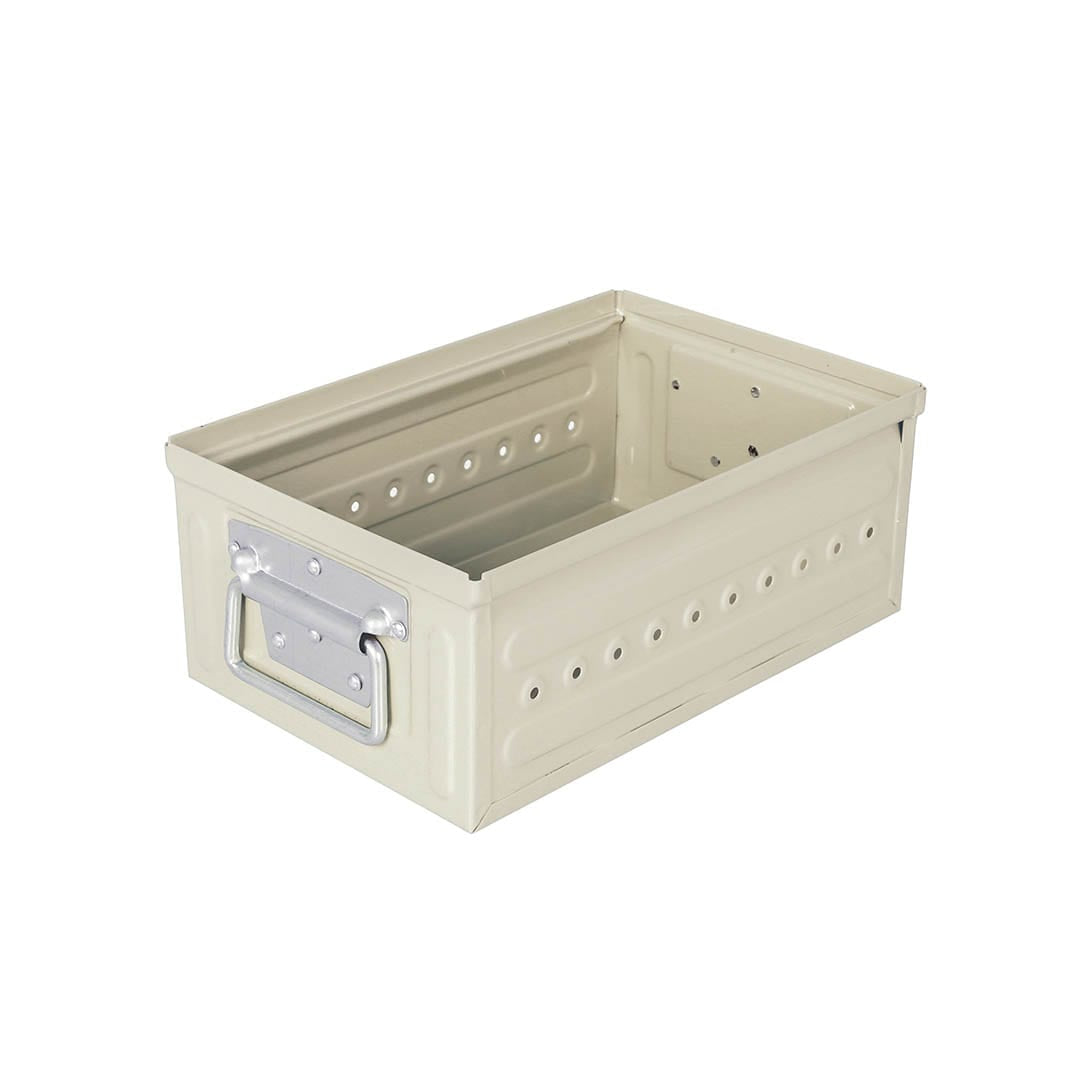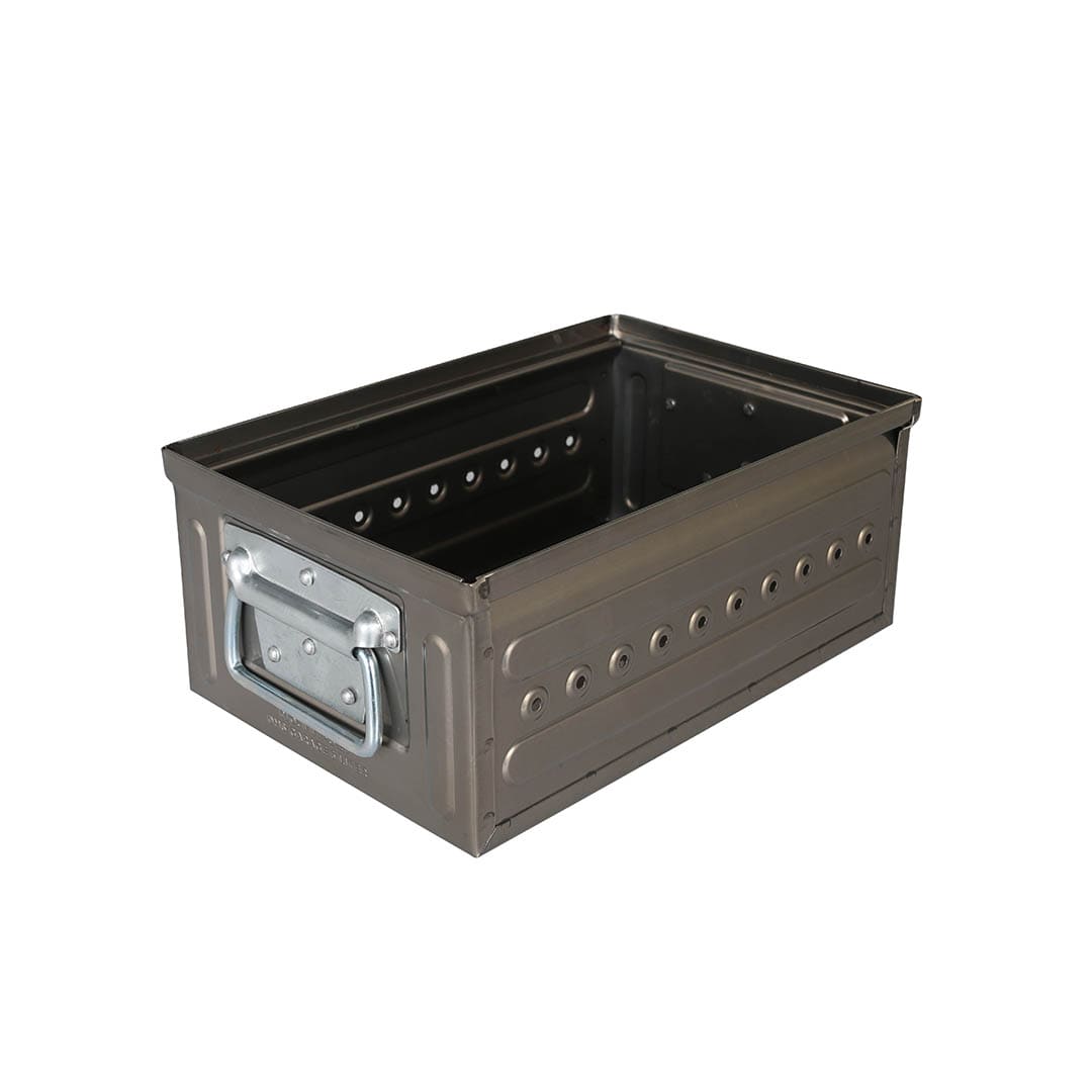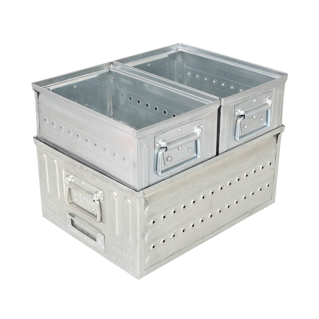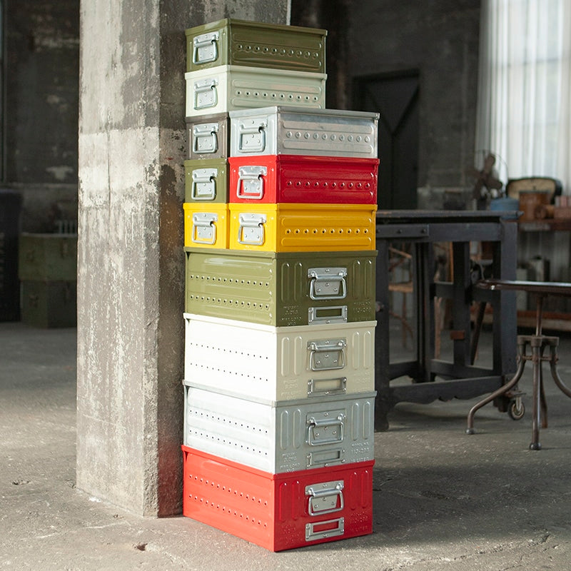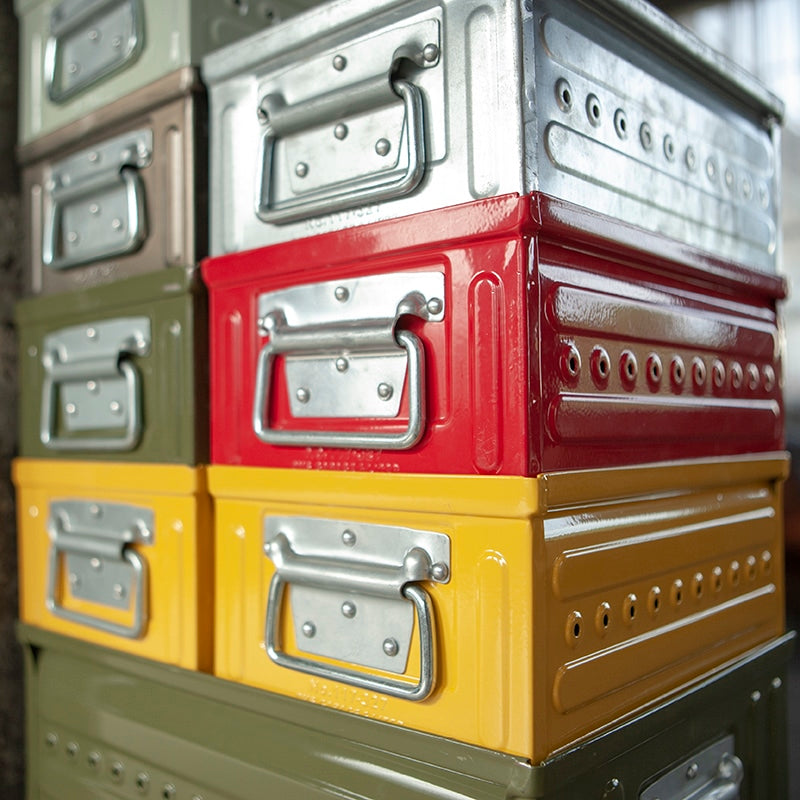 タフでハードなルックスそのままの性格。"軽量化"や"折畳み可能"なんていう言葉は彼の辞書にありません。スタッキングしても、物を入れても響く金属音は決して小さくは無いけれど、それ位不器用な奴と過ごすのも面白い。ちょっと乱暴に使ってこそ分かり合える相棒かもしれません。サイズ違いとスタッキングが可能です。