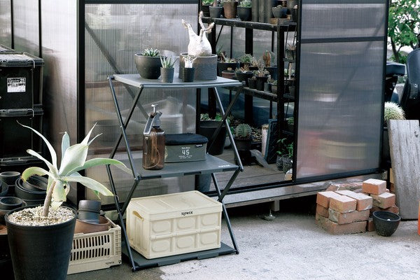 テーブルと3段ラックの2WAYラックです。お好みの用途に合わせて変形可能で、収納時や持ち運び時は厚さ約70mmとスリムになります。アウトドアレジャーの簡易的なテーブル・ラックとしてだけでなく、インテリアとしてもお使いいただけます。