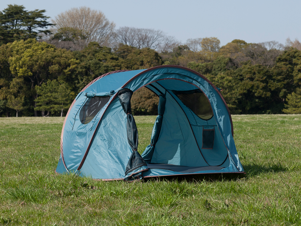 すでにテントにはフレームが入った状態なので、収納袋から広げるだけでテントの設営が可能です。