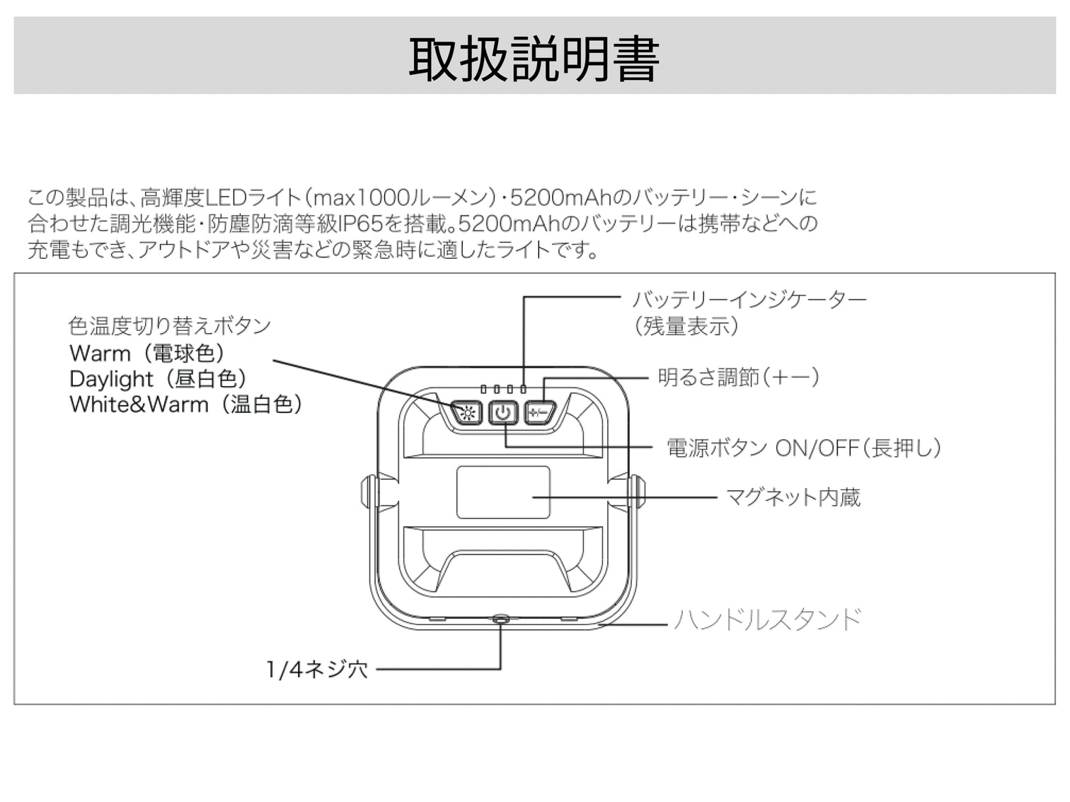 3つの色温度・5段階の明るさ調整ができ、最大光量は1,000lm (White&Warm時)