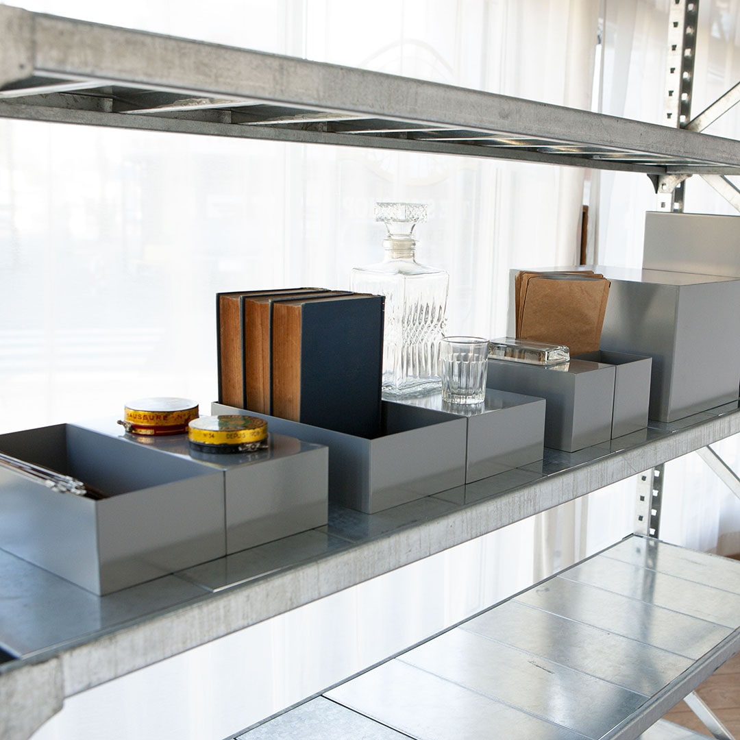 無機質で頑丈なアイアン製の収納ボックス。 しっかりとした重量感で、ちょっとした衝撃でずれてしまう心配はありません。 収納としての使用はもちろん、逆さにすることでちょっとした置き台に早変わり。 シリーズで複数並べるとすっきりと統一感が出せます。 ステーショナリーや工具等を立てて収納できる仕切り付きタイプ。