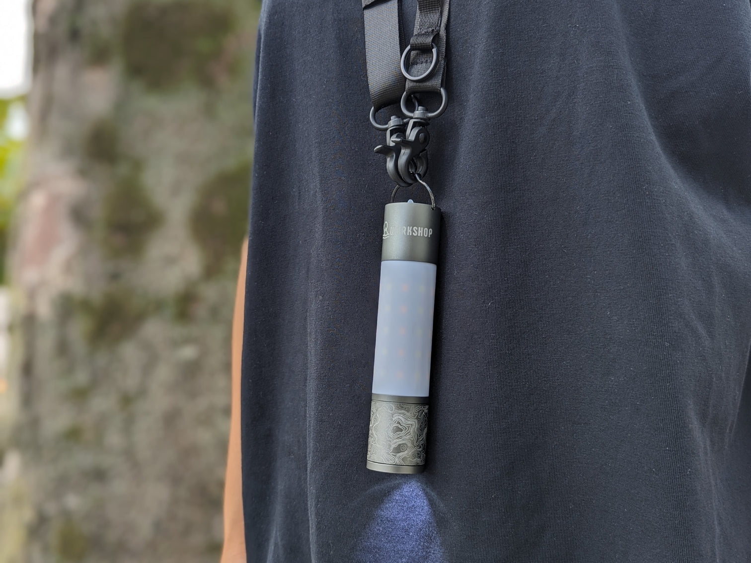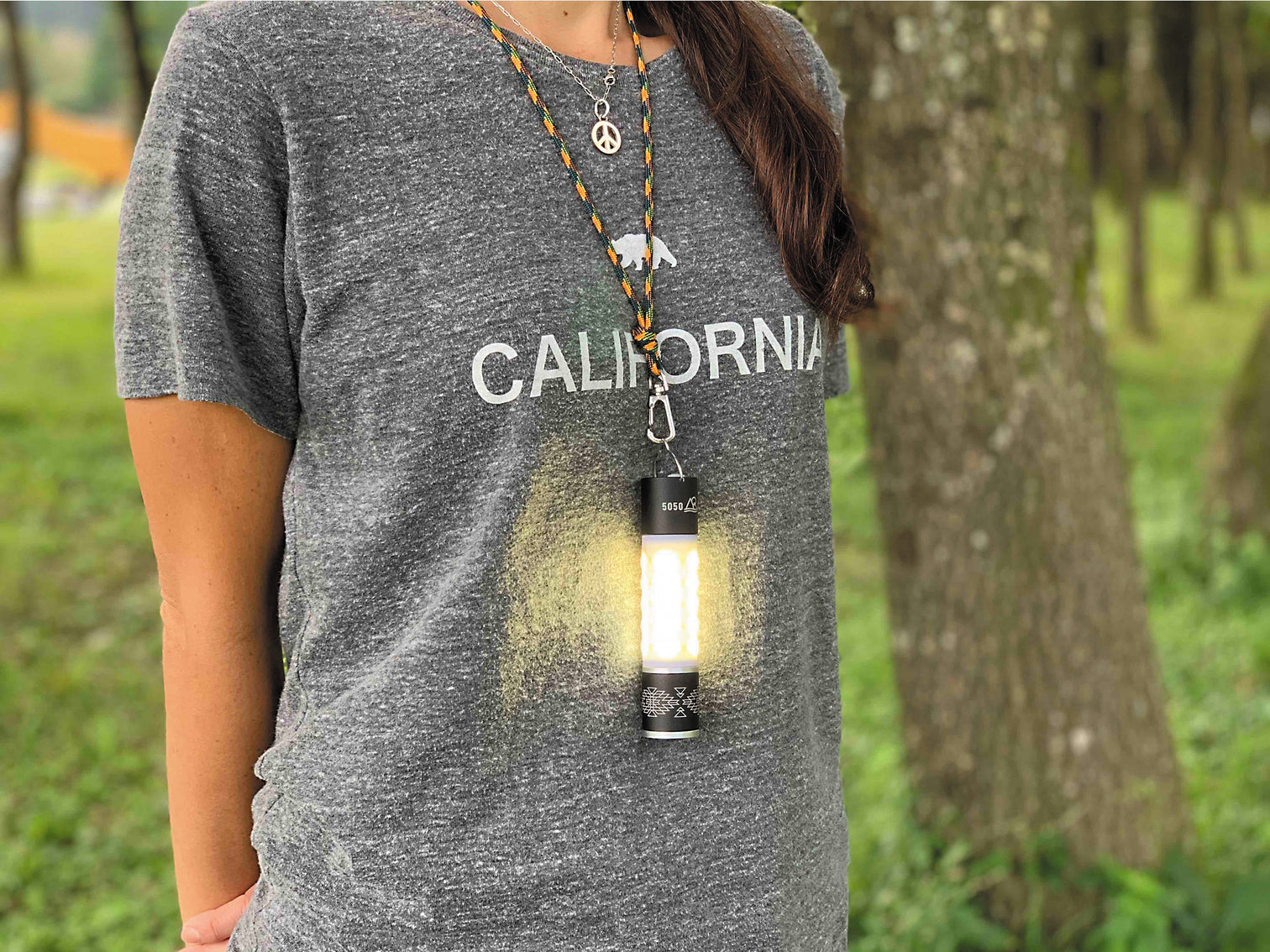 シチュエーションに合わせてハンディライトにもランタンにもなるLEDライト。ハンディライトは照射範囲をズームして調整することで広範囲を照らしたり、最長100m先も照らすことができます。光の強さを2段階で調整できる上、ランタンは雰囲気に合わせて色温度も選択可能。市販のネックストラップやカラビナに付けることもできます。いざという時はモバイルバッテリーとしても使用できます。