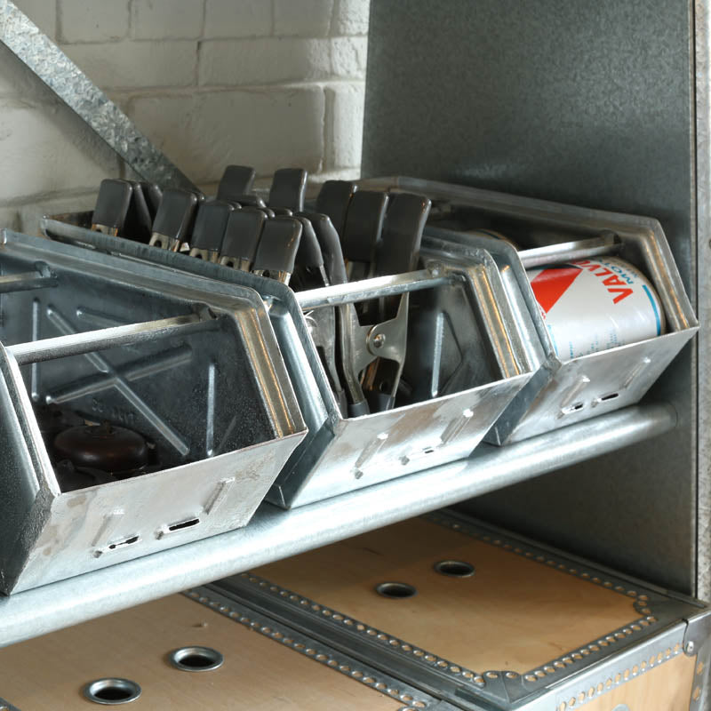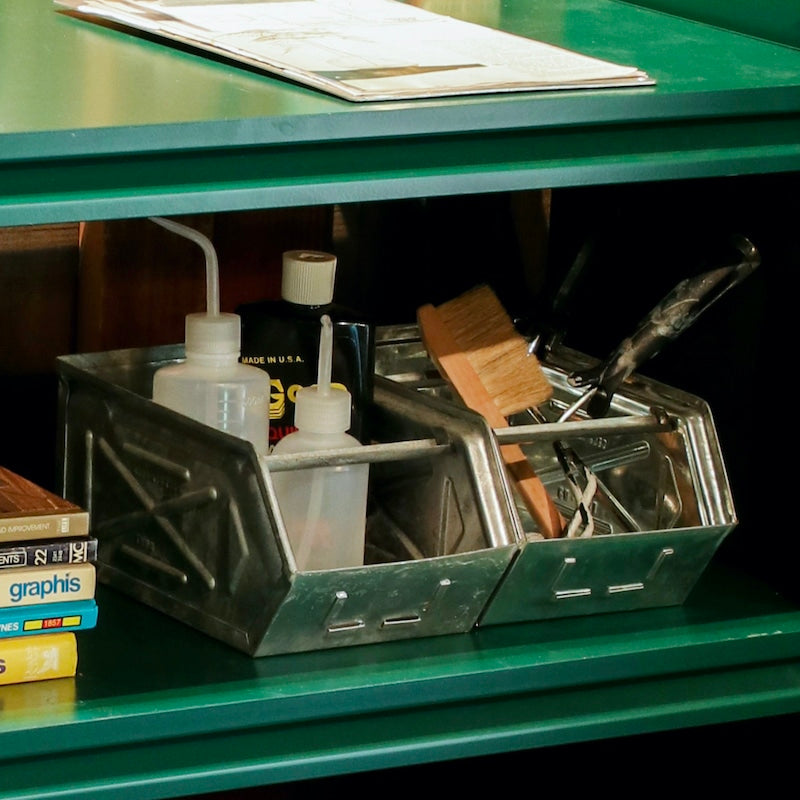 不思議と心を惹きつける、無骨なパーツストッカー。ガレージではスタッキングで収納力を発揮し、キッチンやリビングでは生活感を消してくれます。放り込んでおくだけでも絵になり、整え過ぎずに整えられる、気取りすぎない塩梅がとても心地良い。飲食店からの需要も高い、隠れた人気者。