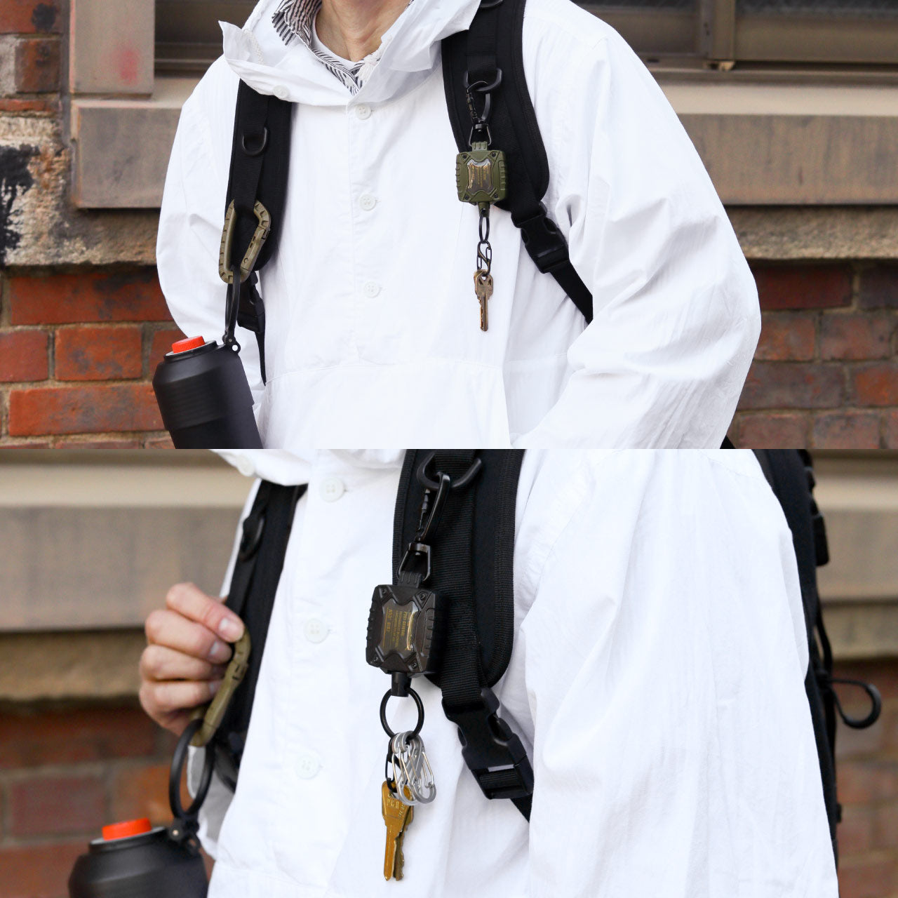 カラビナ式でリュックやバッグ・ベルトプループに簡単に取り付け可能。