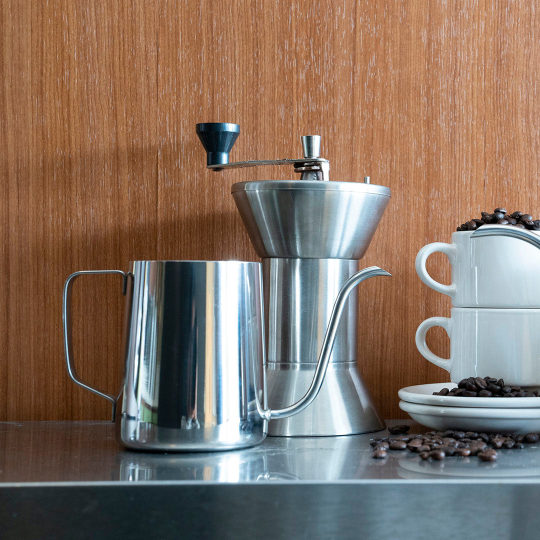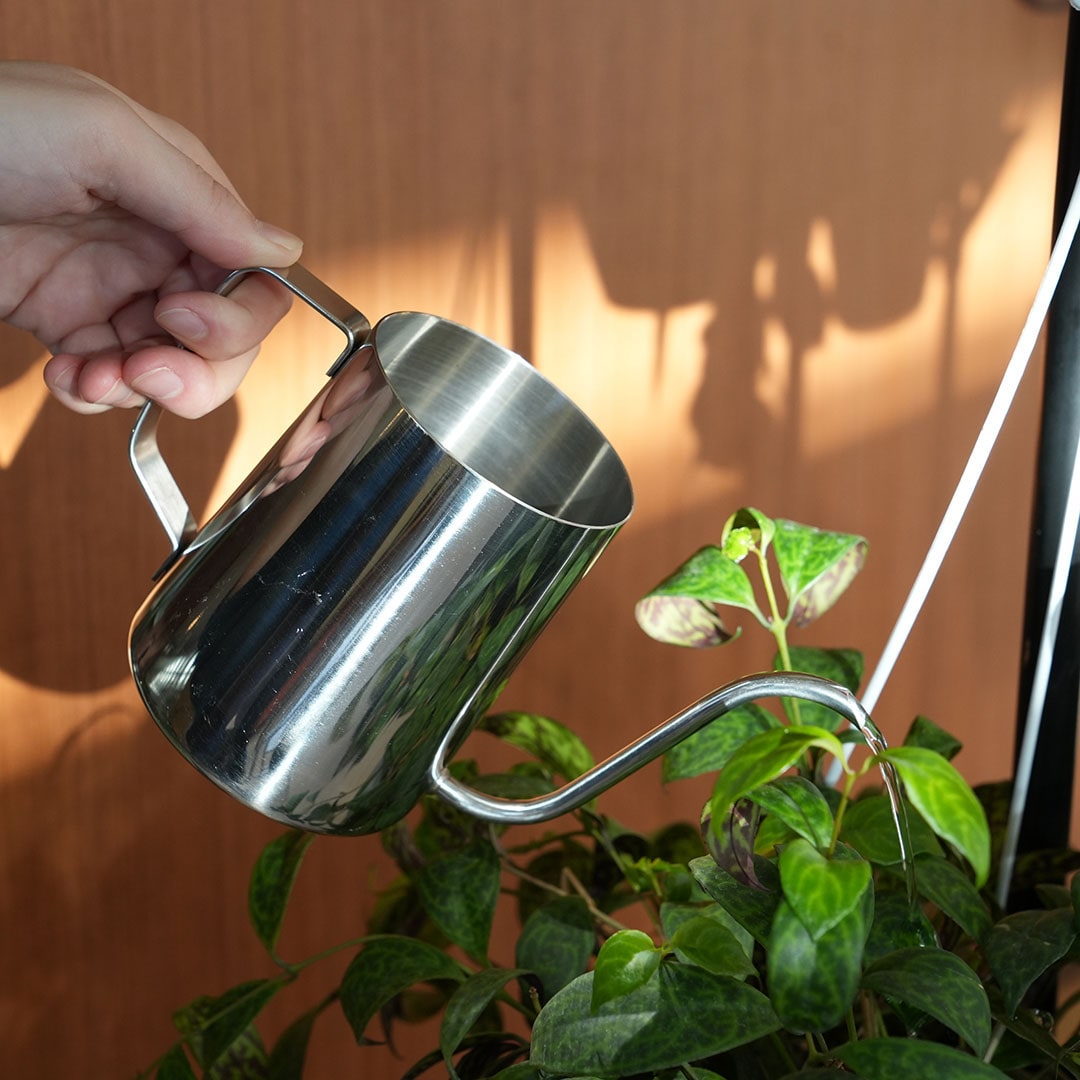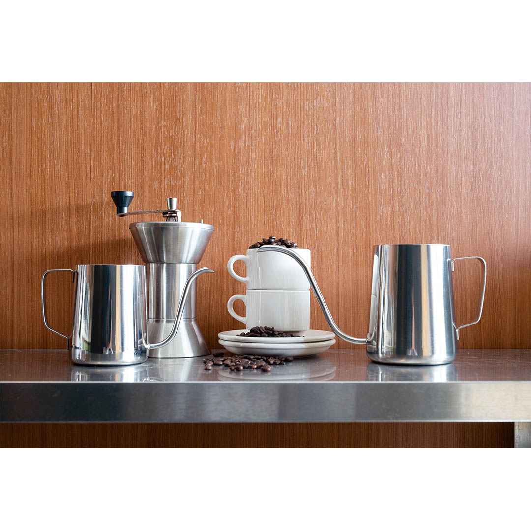 ドリップコーヒーを淹れるには 、一定量のお湯を細く注げるドリップポットが最適。 お湯を注ぐ時の量、スピードを意識するだけで、いつもの数倍もおいしいコーヒーが飲めます。 フタも装飾も無いシンプルなポットは飽きが来ず、シンプル派がこだわる美しく整然とした景観も乱しません。 程よい水圧は植物への水やりにも。