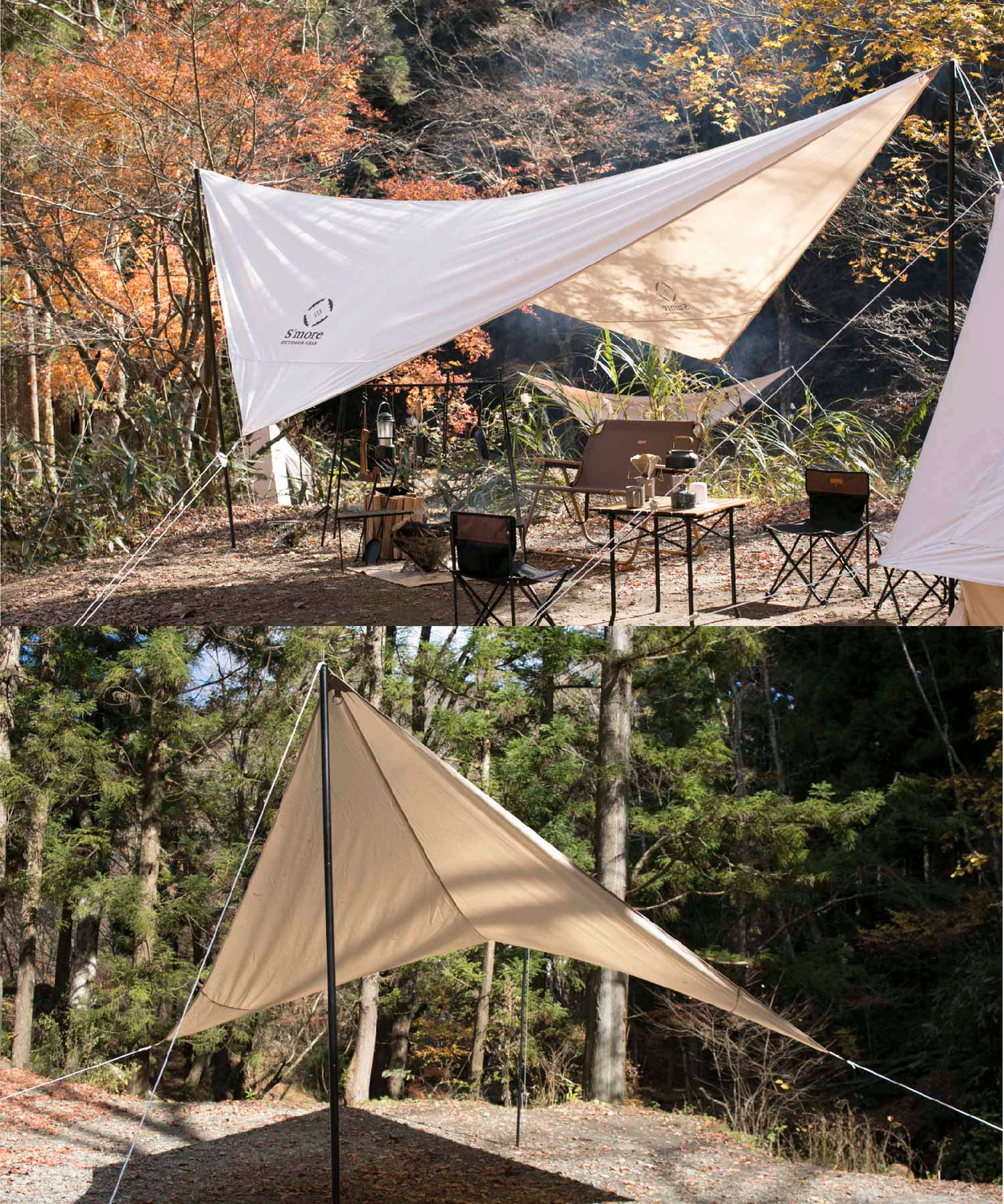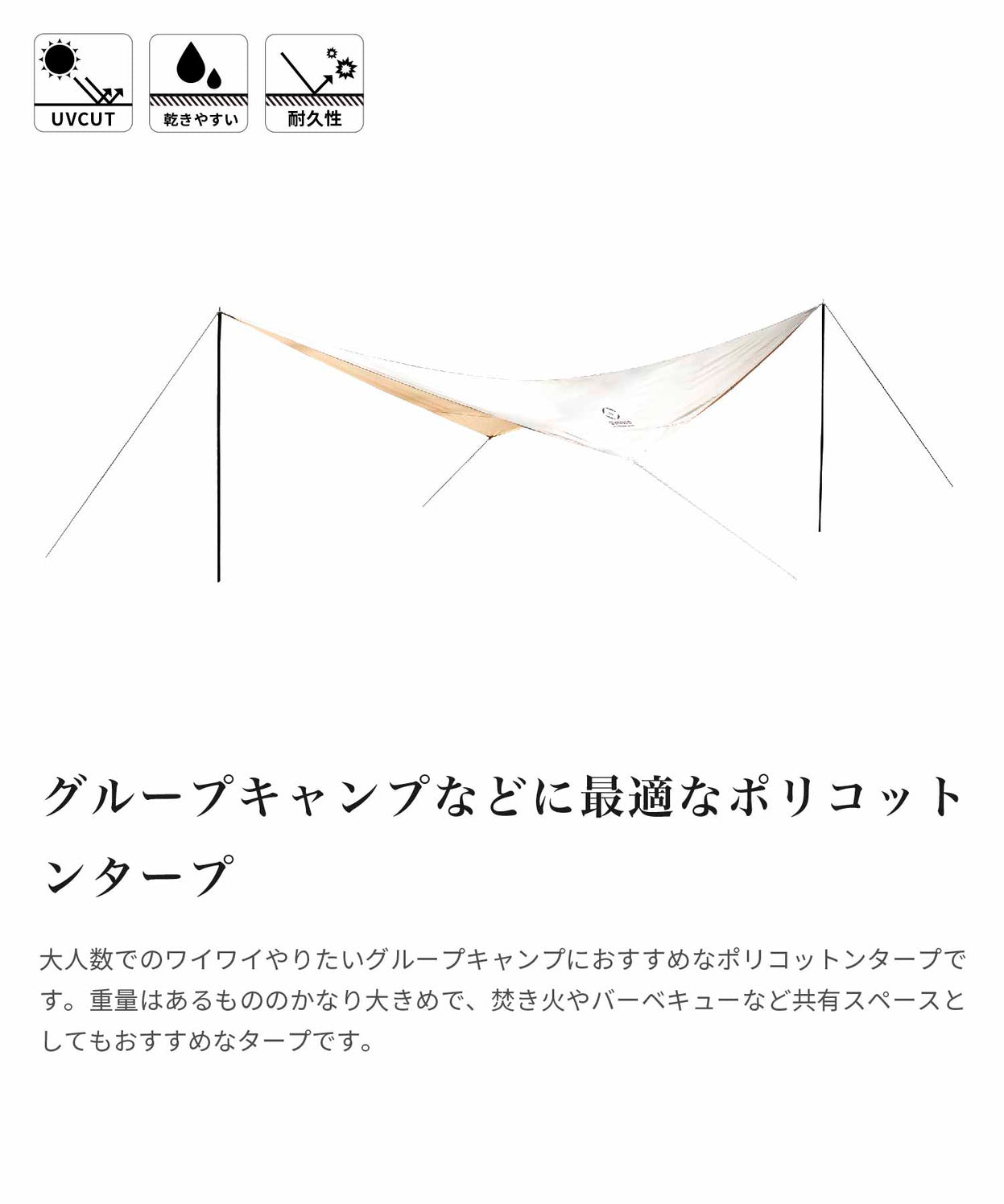 大人数でのワイワイやりたいグループキャンプにおすすめなポリコットンタープです。重量はあるもののかなり大きめで、焚き火やバーベキューなど共有スペースとしてもおすすめなタープです。