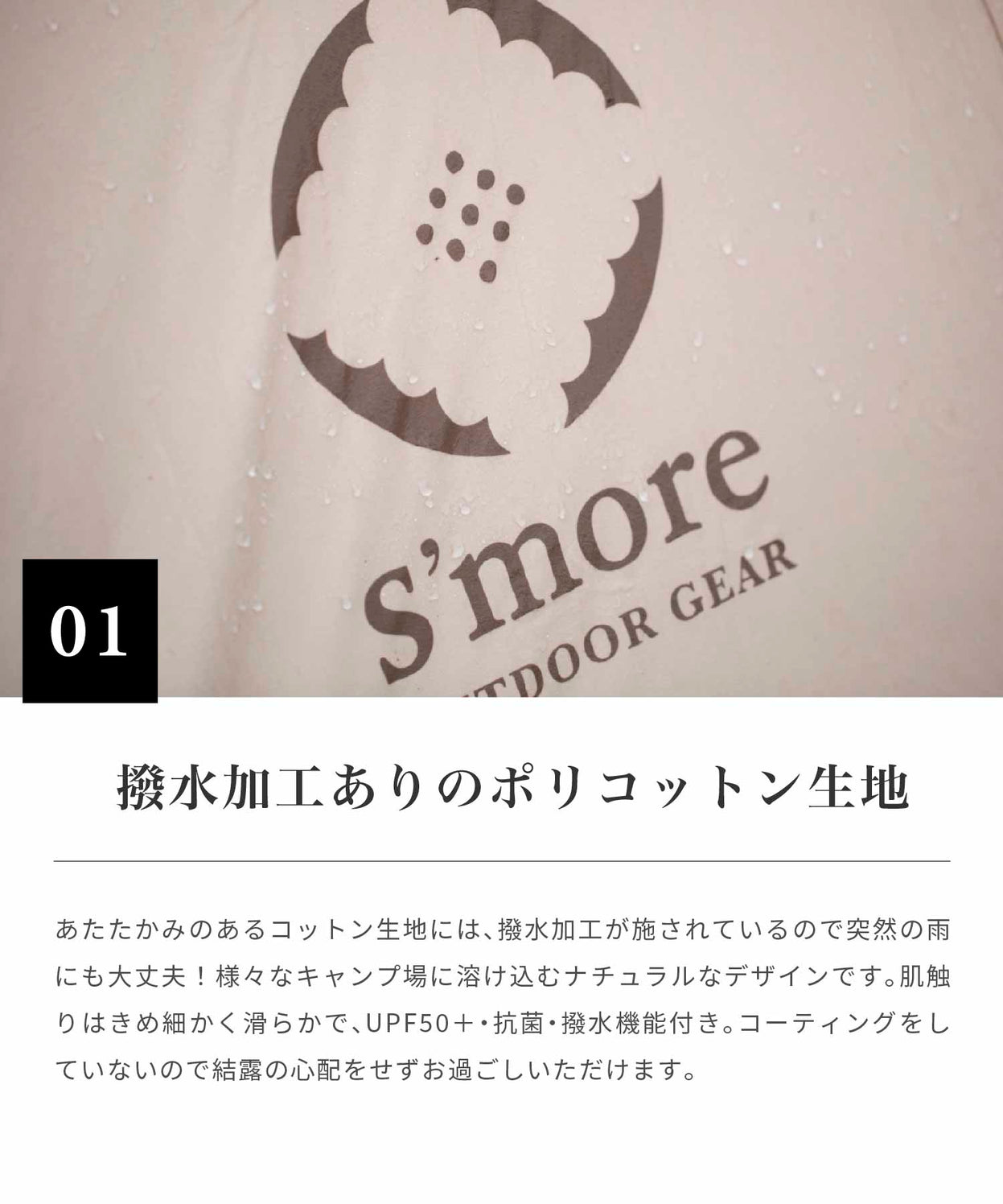 あたたかみのあるコットン生地には、撥水加工が施されているので突然の雨にも大丈夫!様々なキャンプ場に溶け込むナチュラルなデザインです。肌触りはきめ細かく滑らかで、UPF50+・抗菌・撥水機能付き。コーティングをしていないので結露の心配をせずお過ごしいただけます。耐水圧2000mm。
