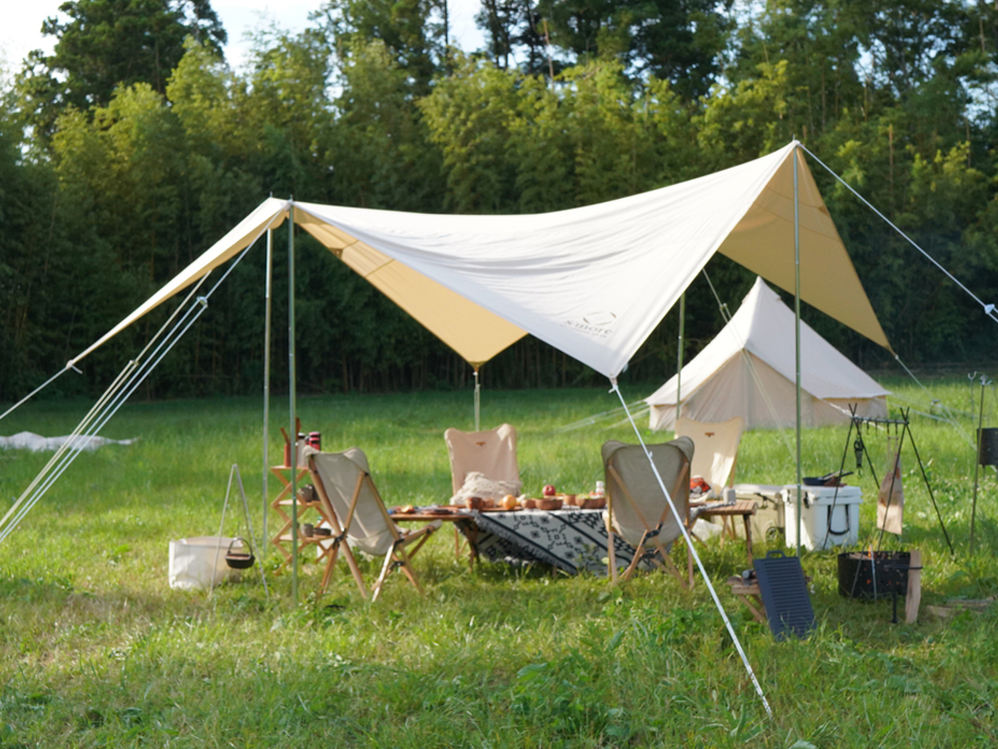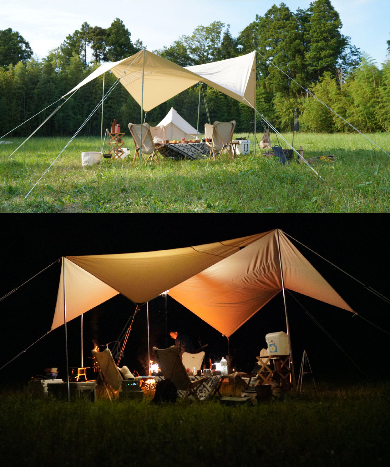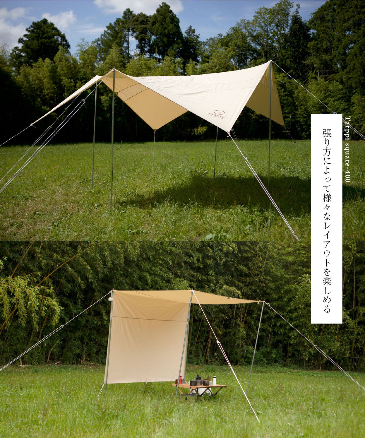 張り方によって様々なレイアウトが楽しめる400×500cmのスクエアタープ。※レイアウトによってはポールの追加が必要です。本製品の付属ポールは2本となっております。