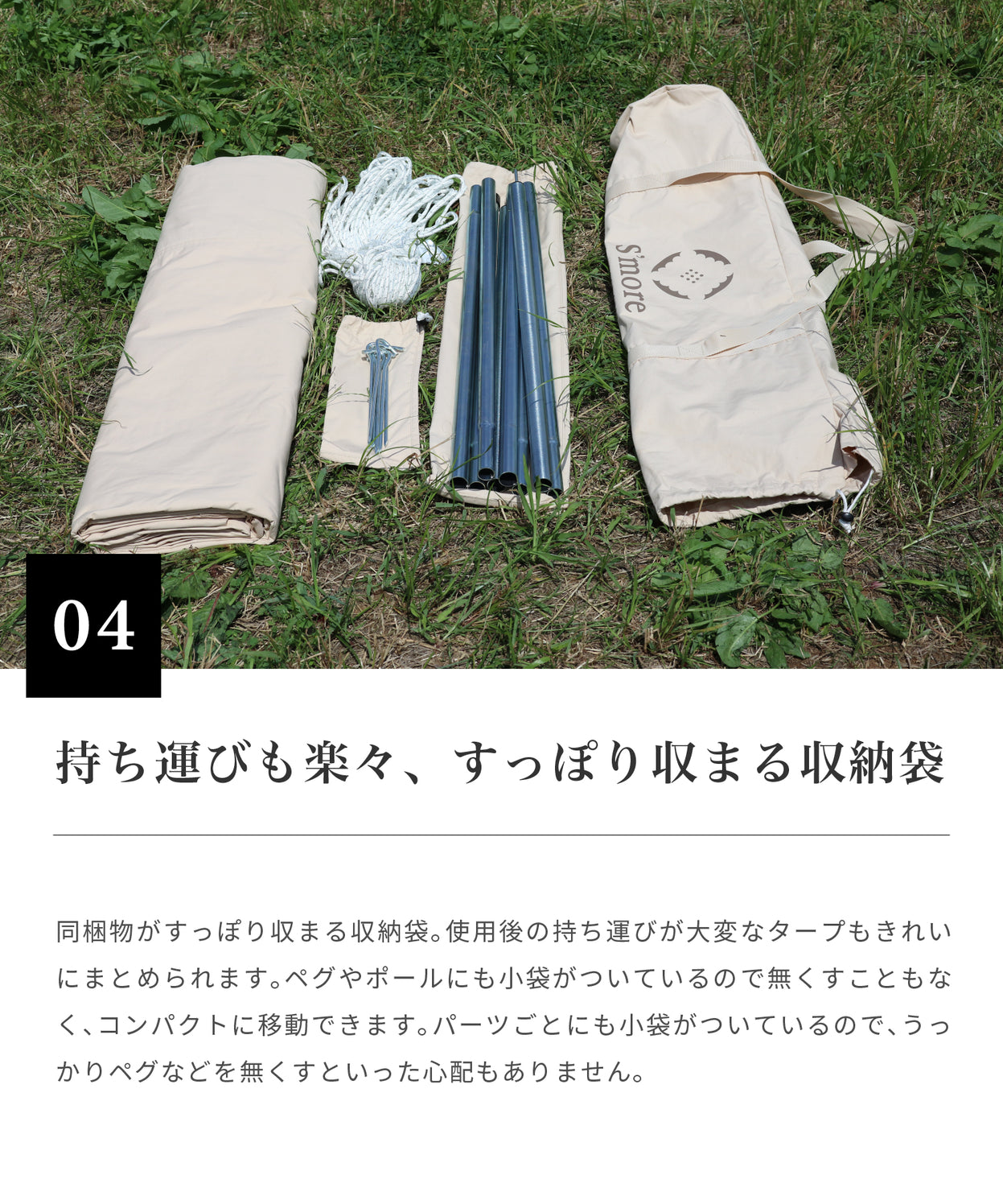 おしゃれな収納バッグ付きで、タープをコンパクトに片付けることが可能です。