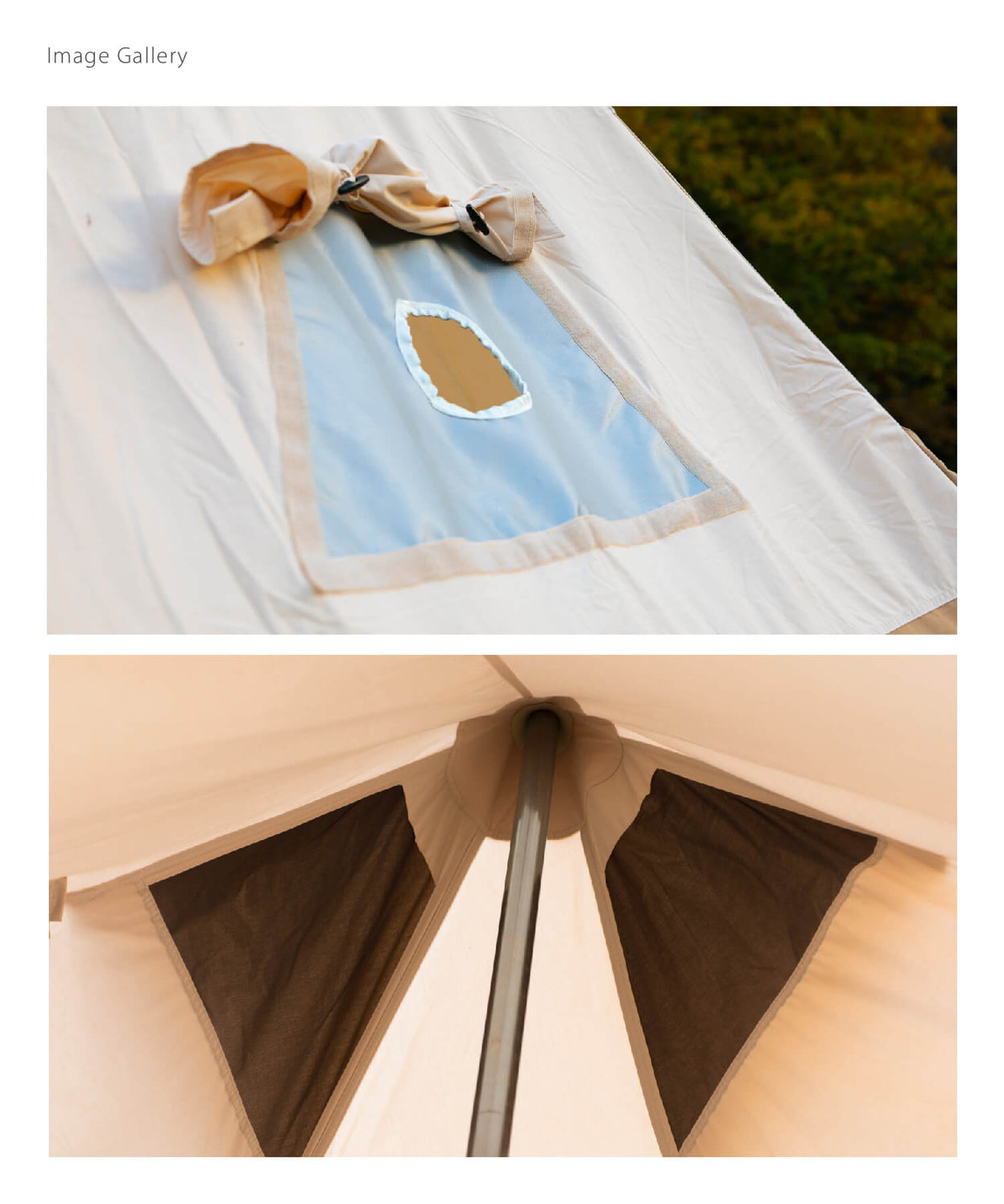 テントの素材はあたたかみのあるTC素材*を使用しています。撥水加工が施されているので突然の雨にも大丈夫!様々なキャンプ場に溶け込むナチュラルなデザインです。肌触りはきめ細かく滑らかで、UPF50+・撥水機能付き。コーティングをしていないので結露しにくい仕様になっております。
