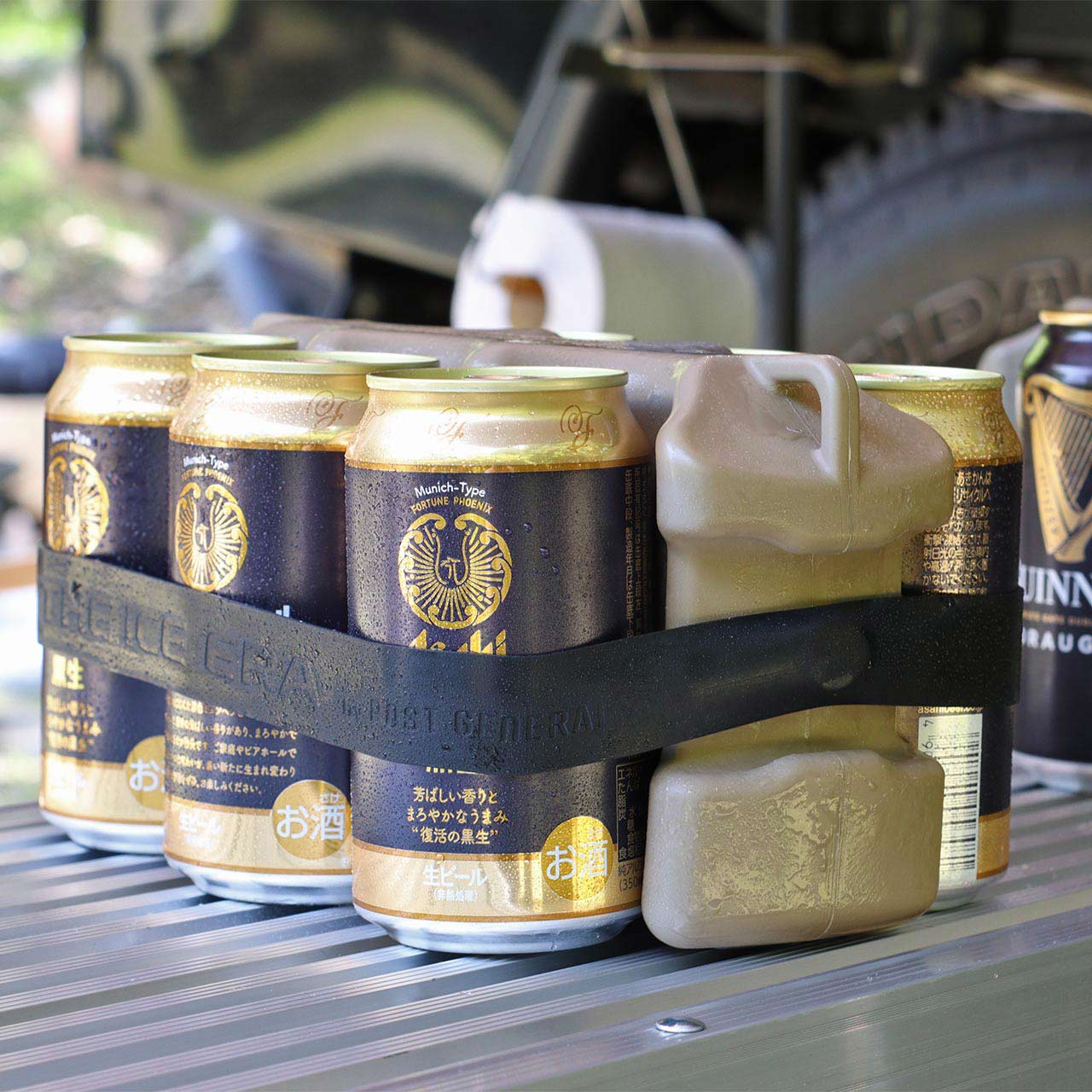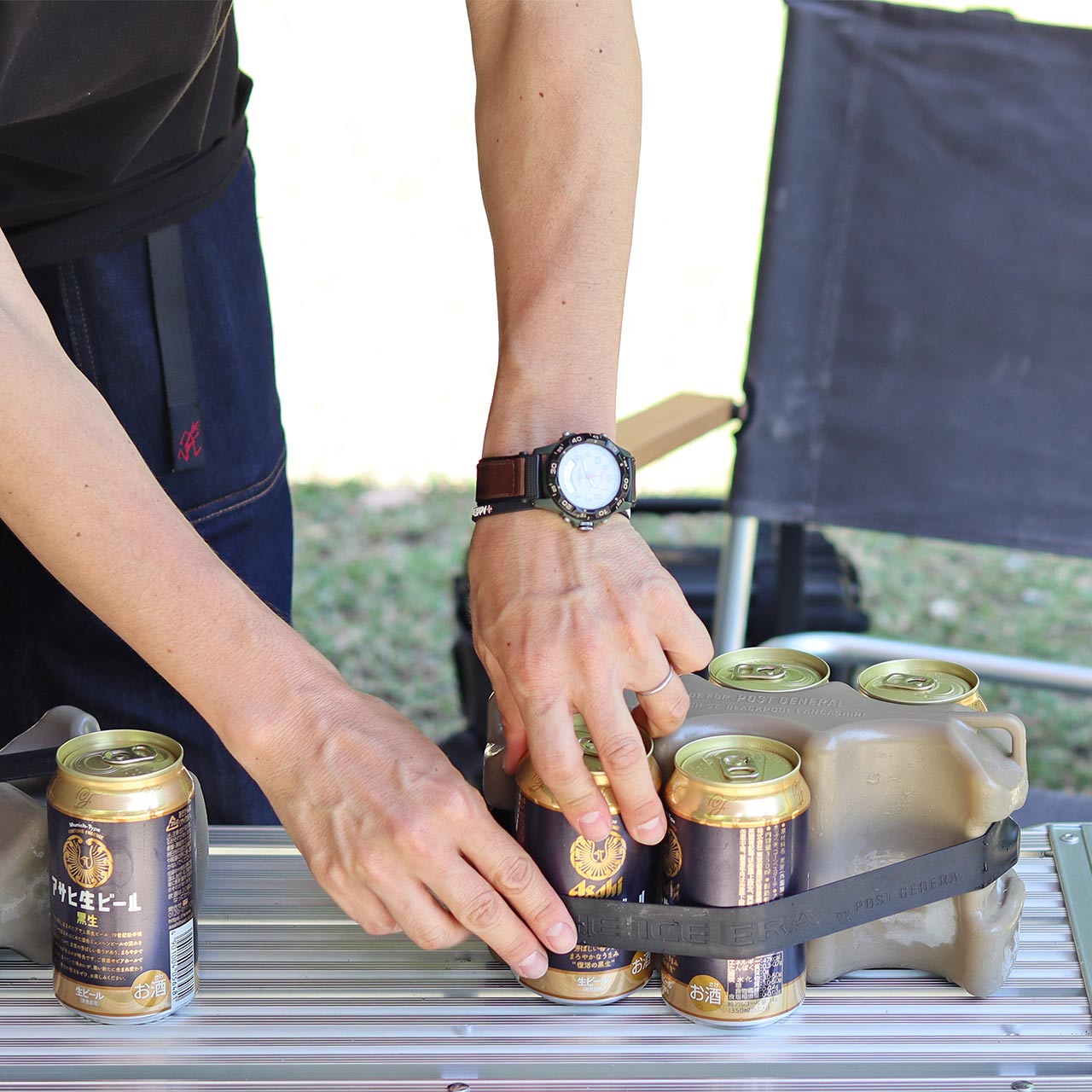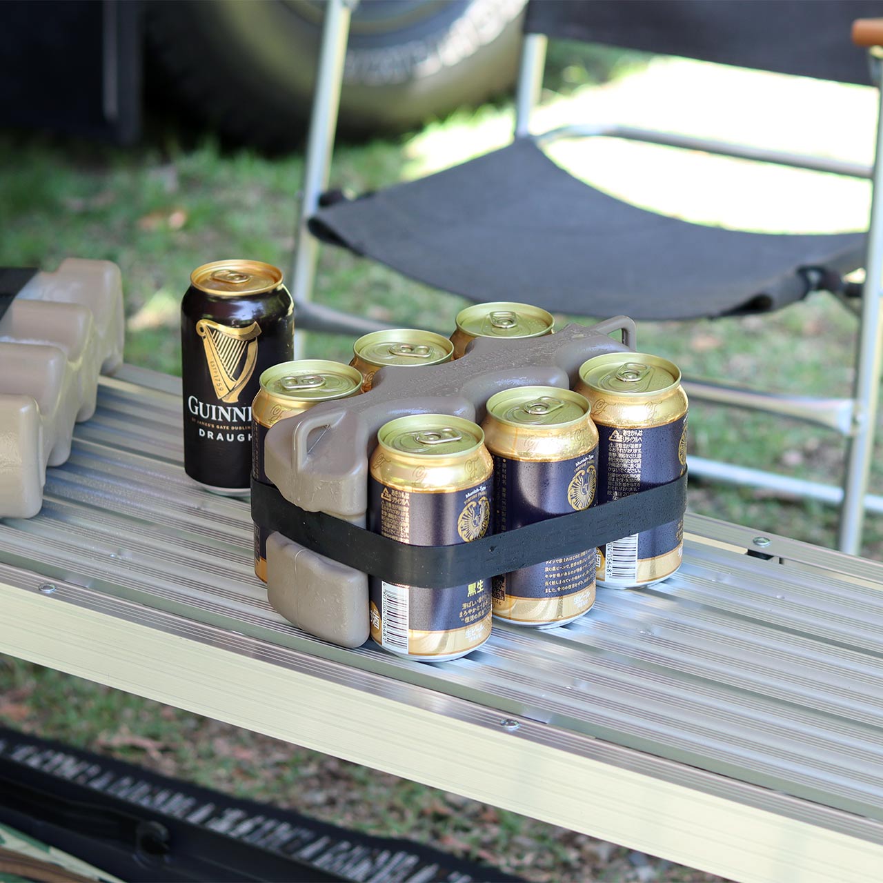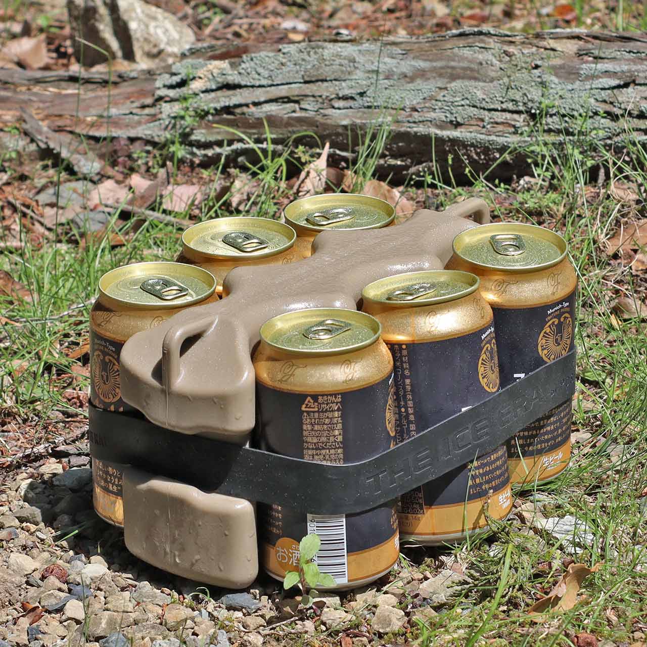 350ml缶や500ml缶、ペットボトルを効率的に保冷する事に特化させた形状で、付属のシリコンバンドで固定する事で、クーラーボックス内でも、常に保冷剤と缶が接地した状態となり保冷効果を高めるデザインです。