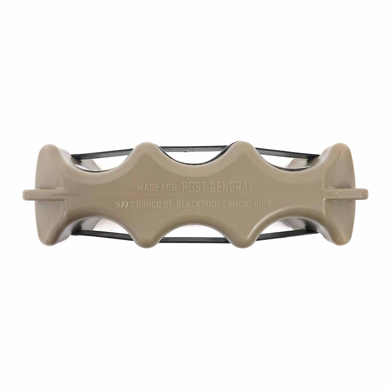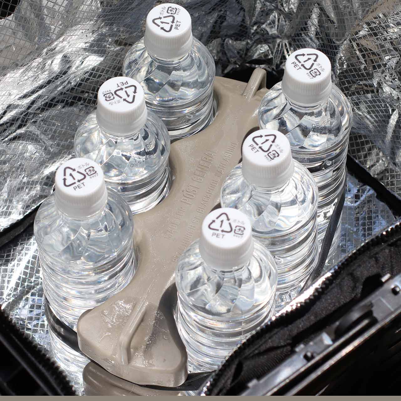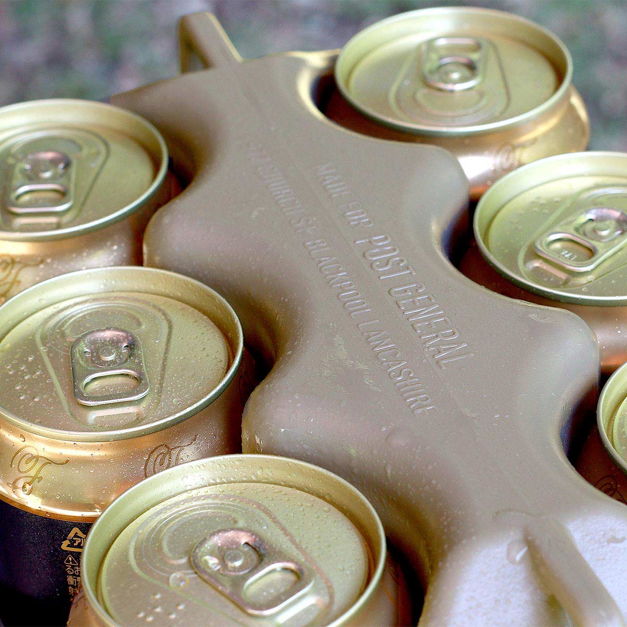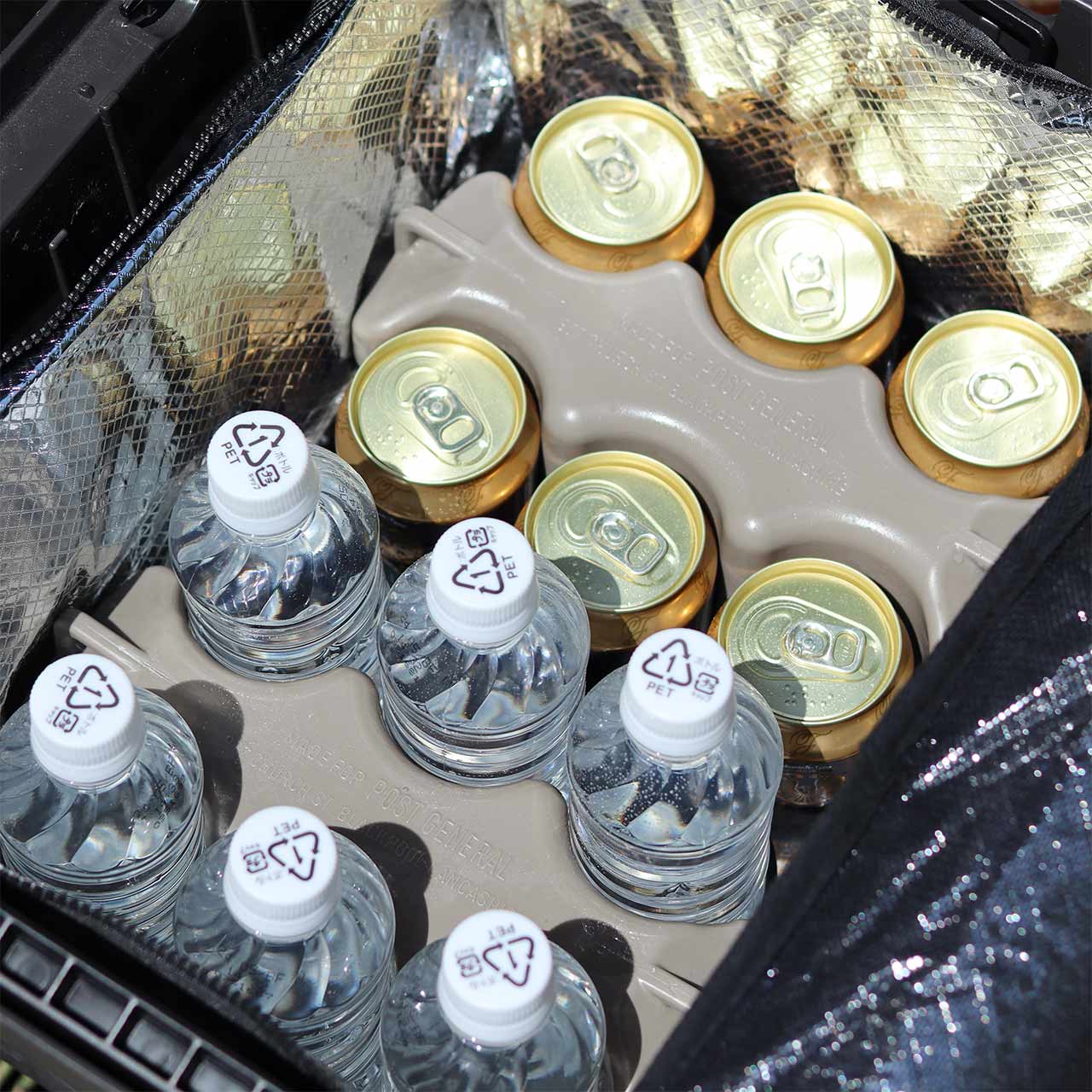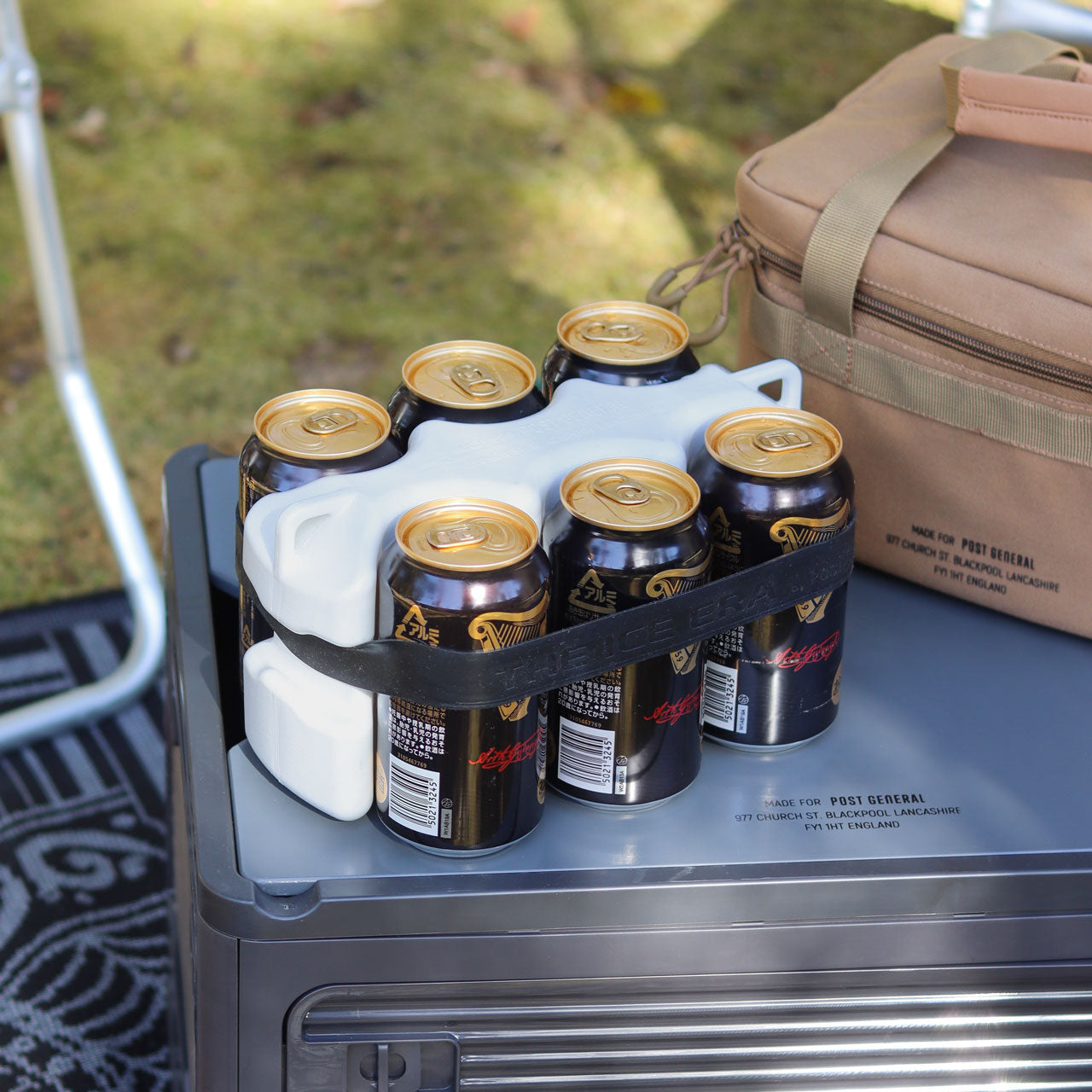 350ml缶や500ml缶、ペットボトルを効率的に保冷する事に特化させた形状で、付属のシリコンバンドで固定する事で、クーラーボックス内でも、常に保冷剤と缶が接地した状態となり保冷効果を高めるデザインです。