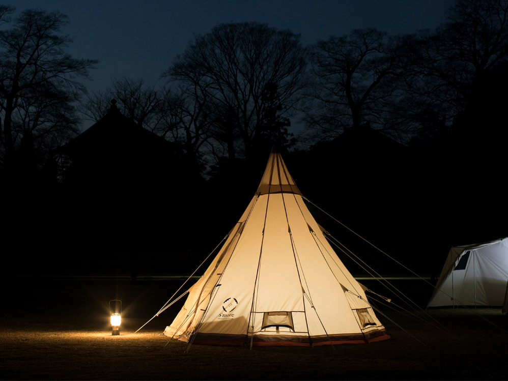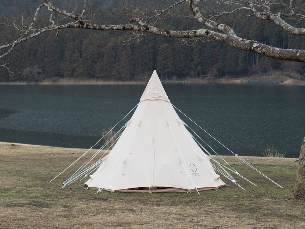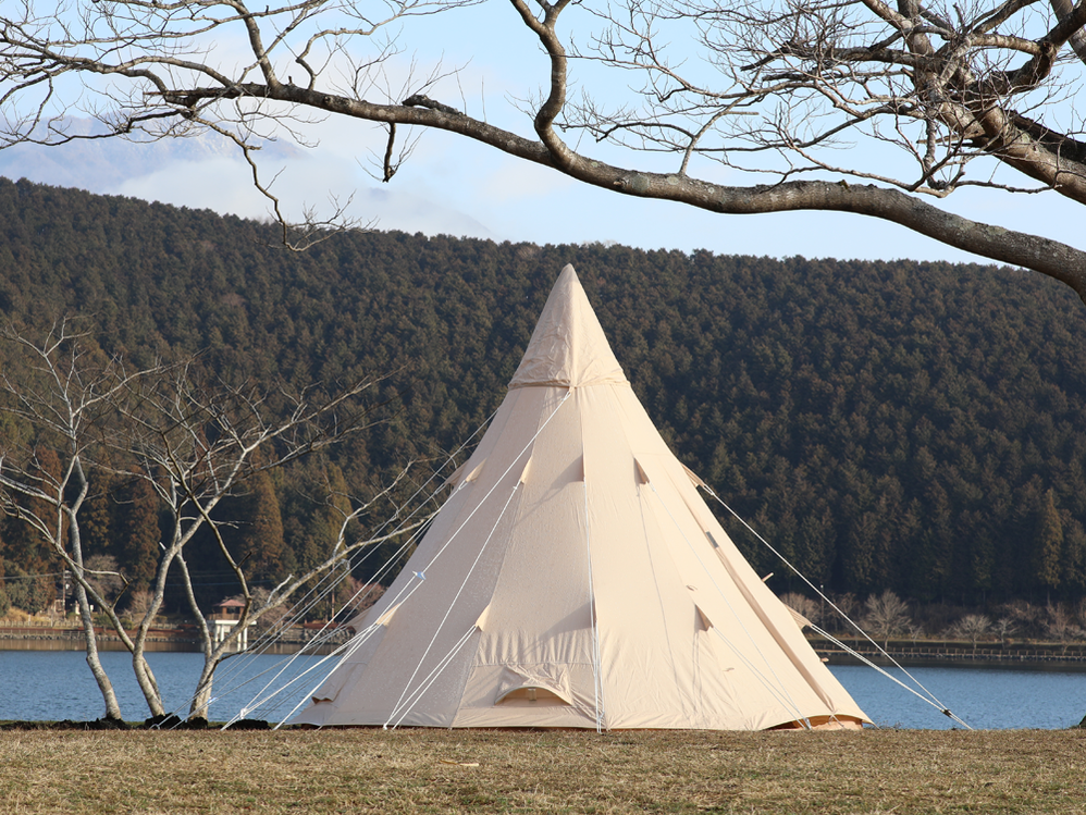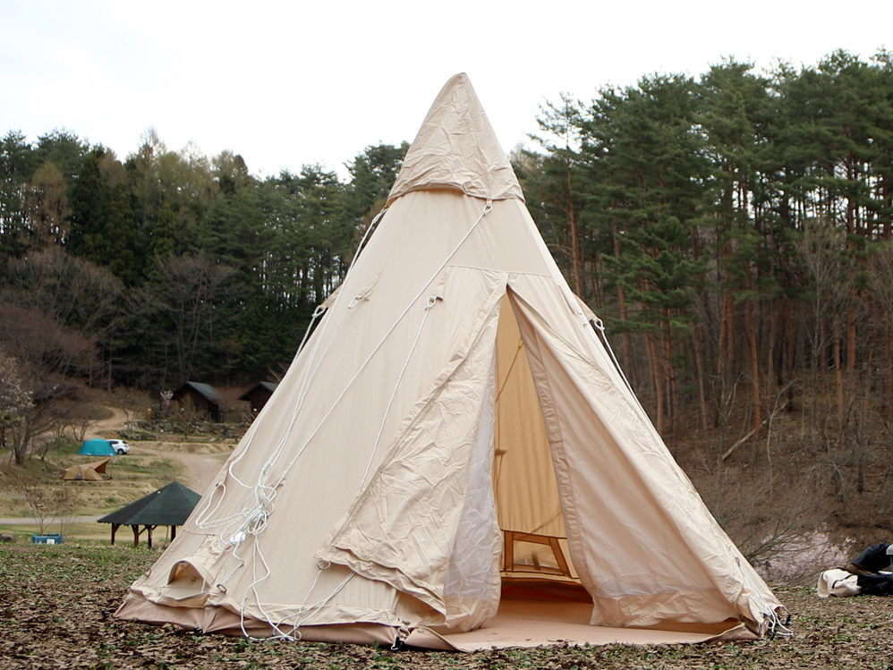 円錐形のとんがり屋根が特徴的なティピ―。中心トップの高さ250cmで中での着替えなどもラクラク。円錐形なので雨が溜まったり雪が積もる心配がないので天候に左右されず安心です。