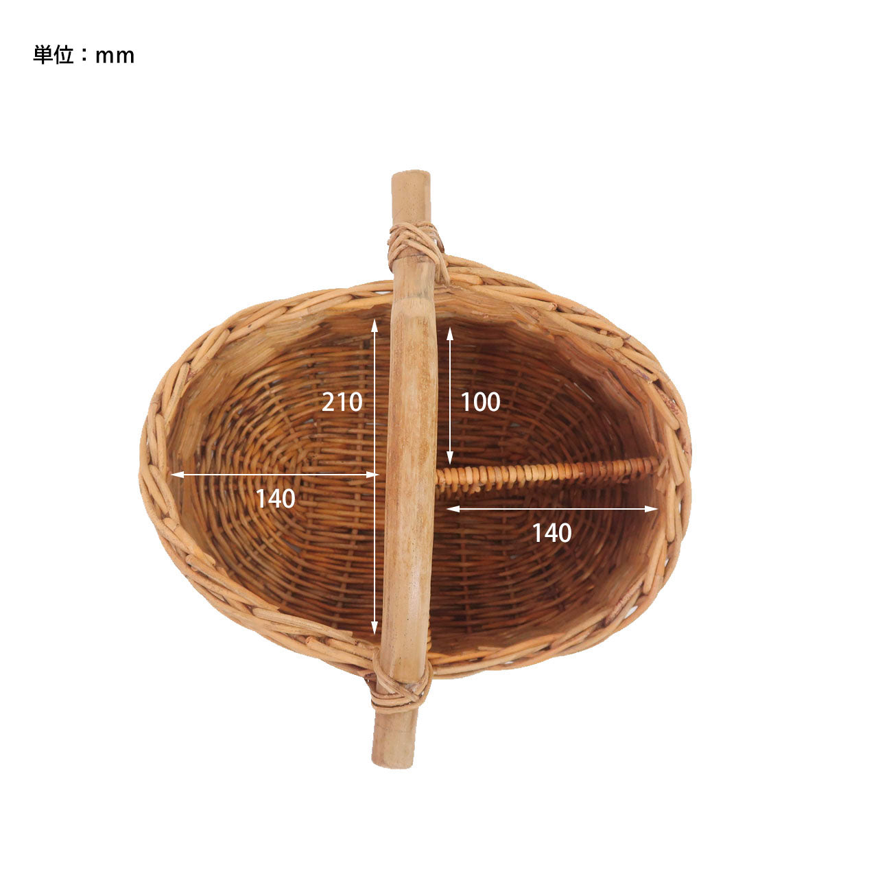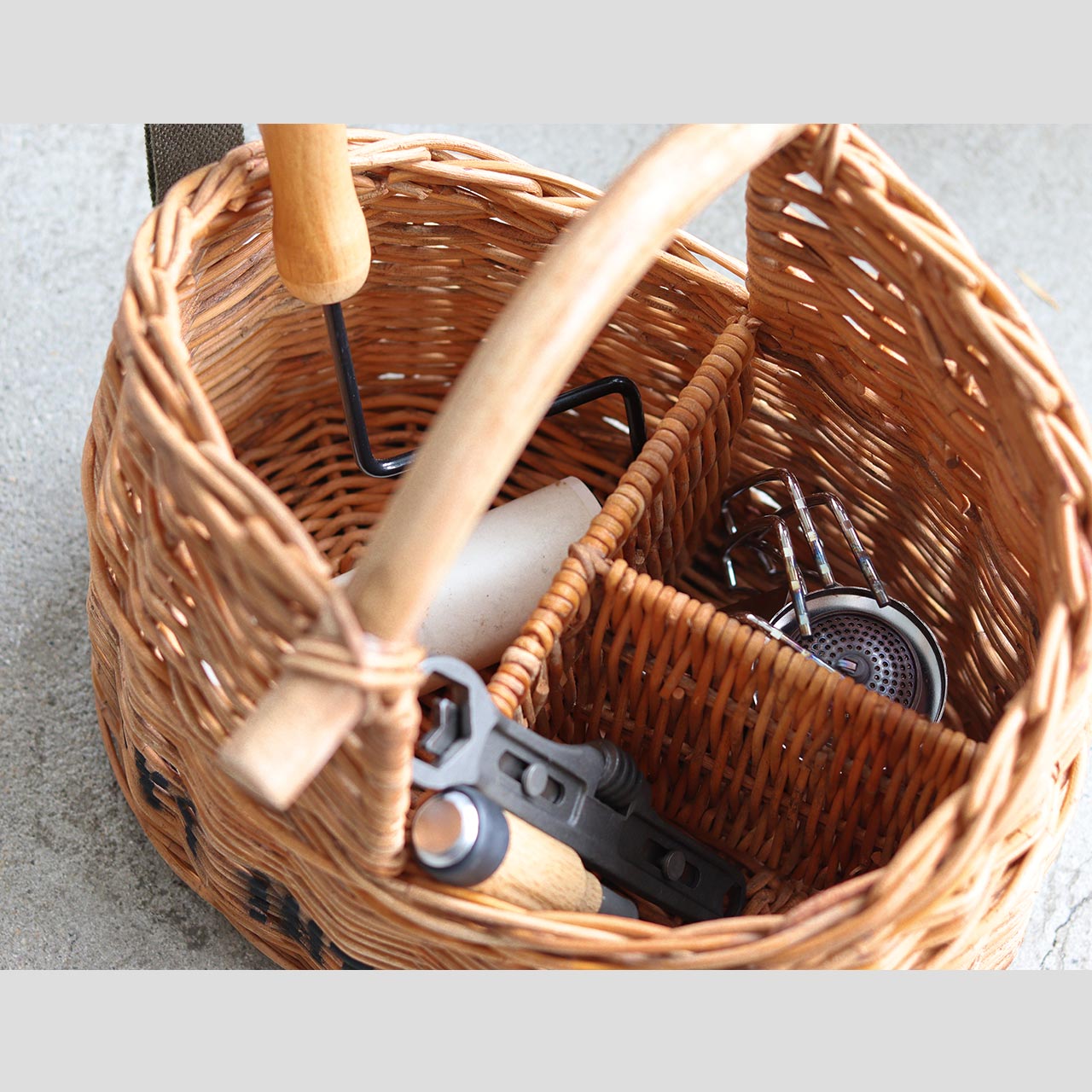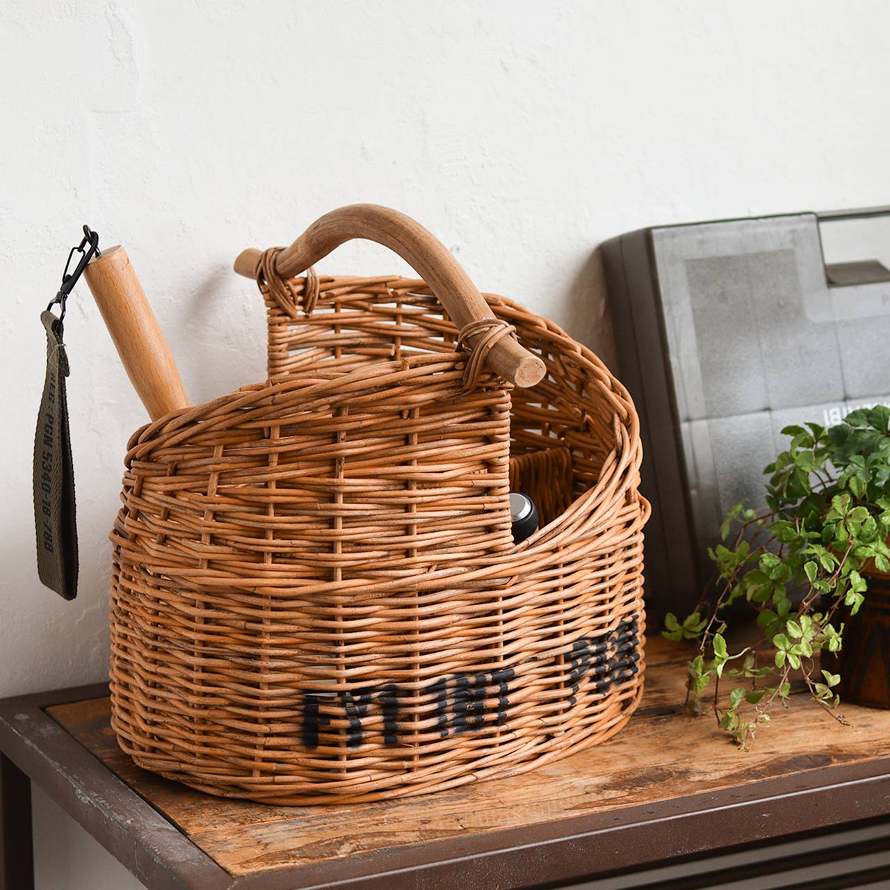 工具や道具を整理しやすい間仕切りを付けたラタン製のハンドルバスケット。