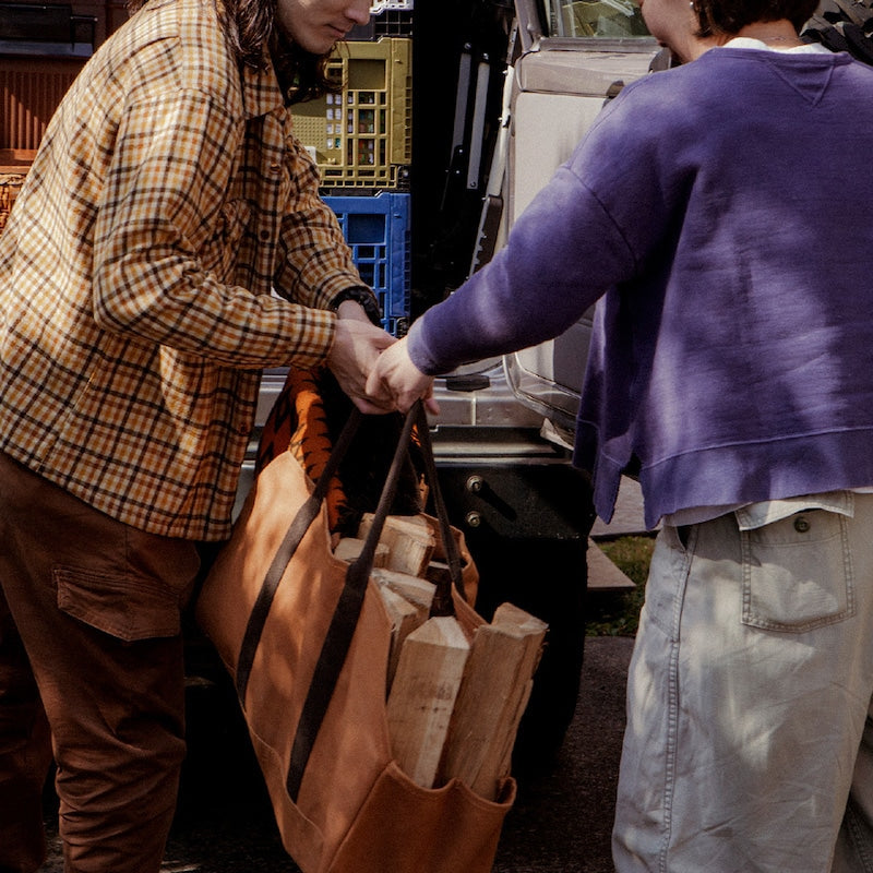 ワックスコーティングを施したキャンバス生地が、どこかビンテージ感を醸し出しているログバッグ。元々薪を運ぶ用として使われるログバッグですが、その他のあらゆるシーンでも使えるように、サイドにマチのあるデザインに仕上げました。薪はもちろん、長いものが何かと多いキャンプグッズなども、まとめて入れて使うことが出来ます。内側には細かいものを入れられるポケットが3つ付いています。