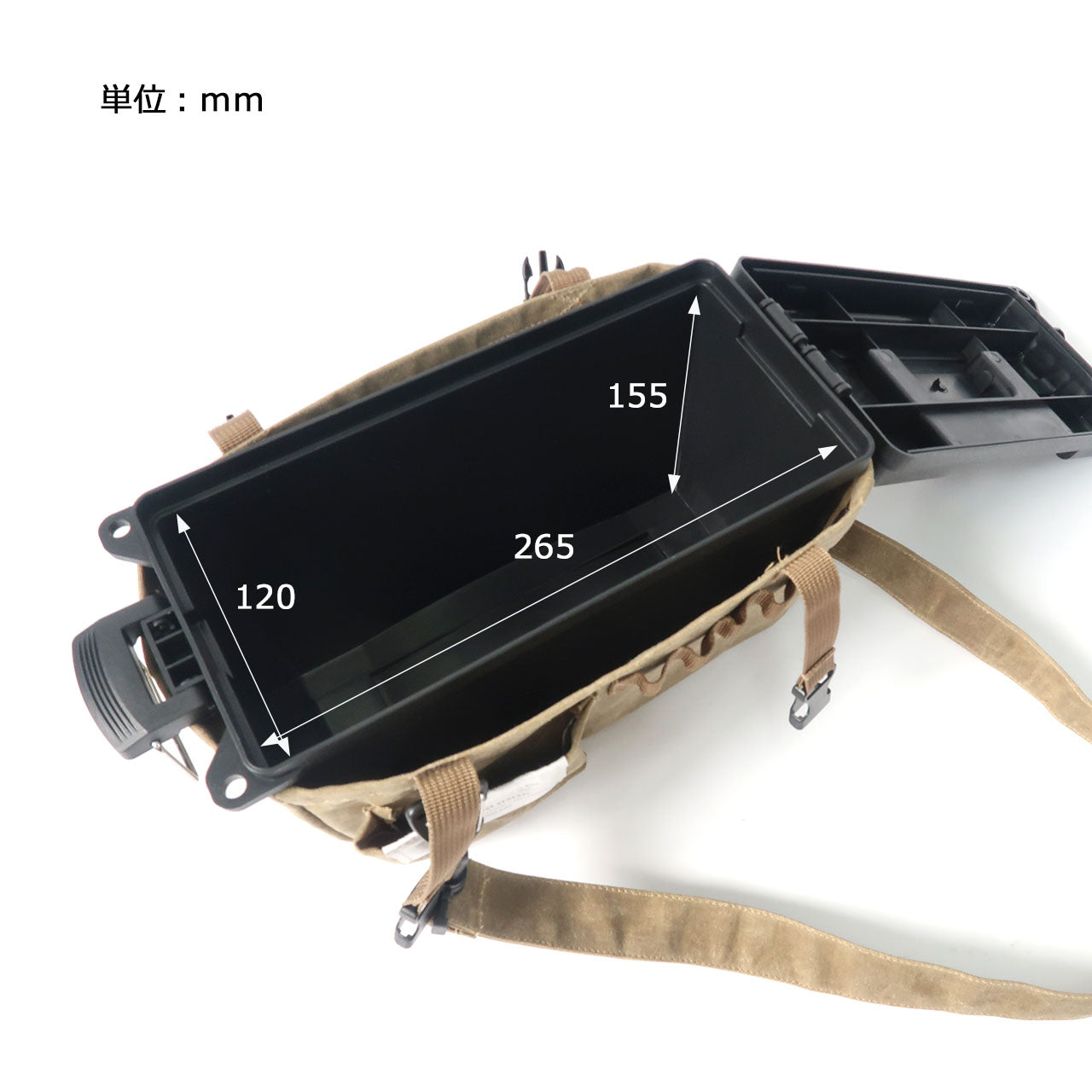 蝋引きキャンバス生地で作ったショルダーバッグ型の専用ケースにアンモボックスをセットしました。