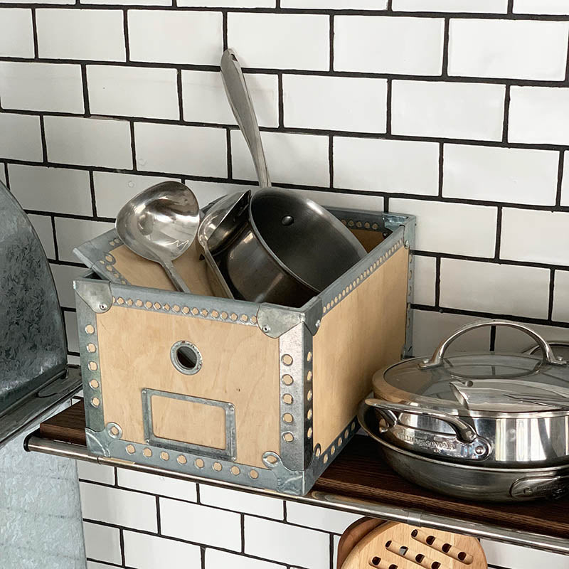 ナチュラルな木のボディに、インダストリアル感漂うスチールのフレームを合わせた収納ボックス。無骨で飾り気のない表情は無愛想だけどそそられます。リビングやクローゼットをはじめ幅広いシーンで活躍。店舗では無造作に積み重ねるだけでオブジェに。